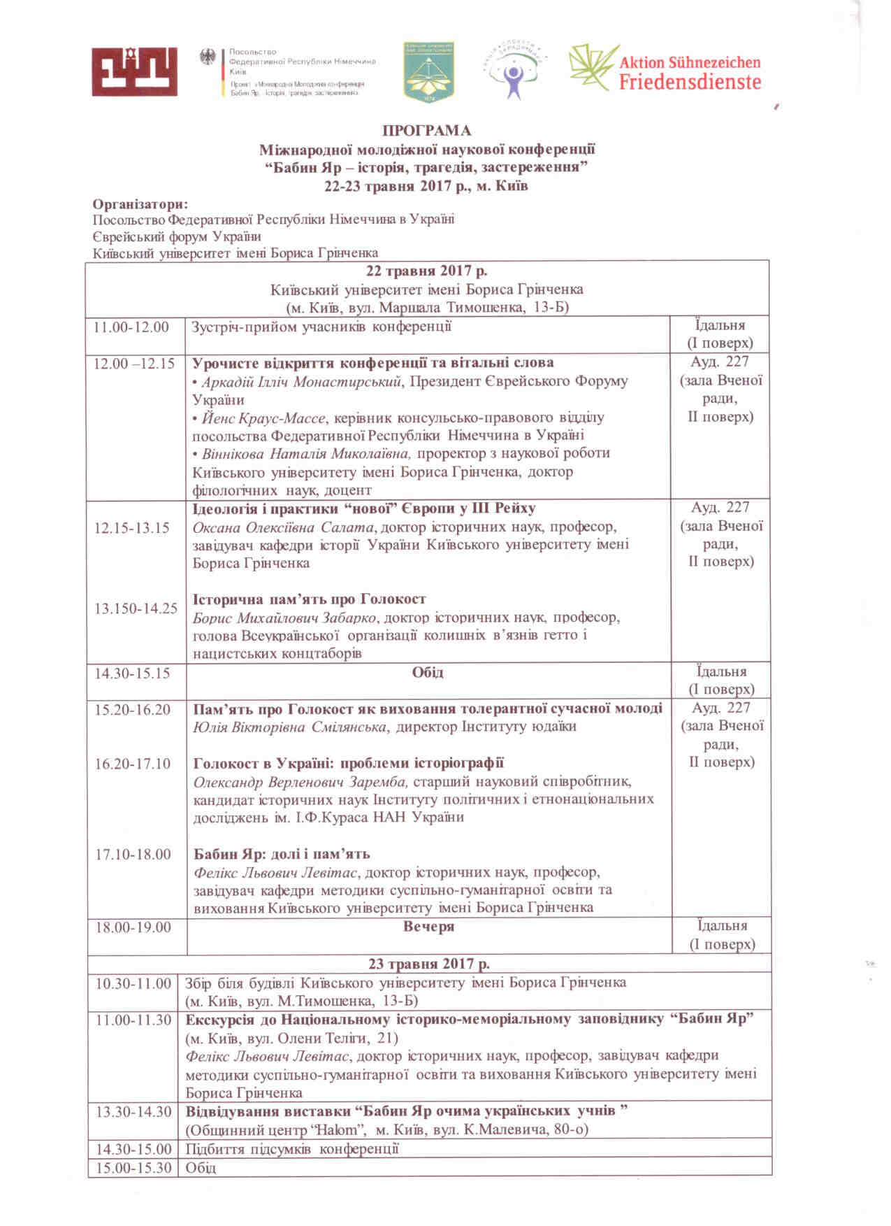 | 2278 | Міжнародна молодіжна наукова конференція "Бабин Яр - історія, трагедія, застереження" | Бабин Яр: долі і пам'ять | м. Київ, Київський Університет ім.Бориса Грінченка |