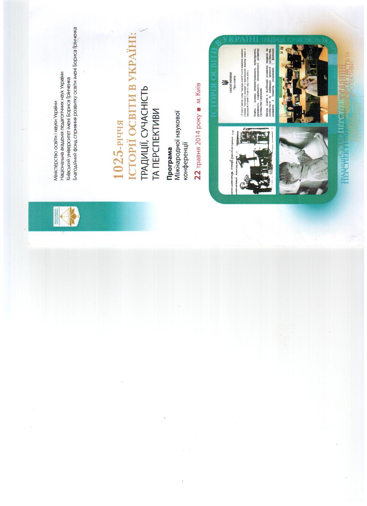 | 4627 | Всеукраїнський науково-методологічний семінар з історії освіти "Регіональні виміри розвитку освітнього простору в Україні" | Розвиток трудового навчання в закладах середньої освіти Київської губернії (друга половина ХІХ ст.):історіографія питання | Київ |