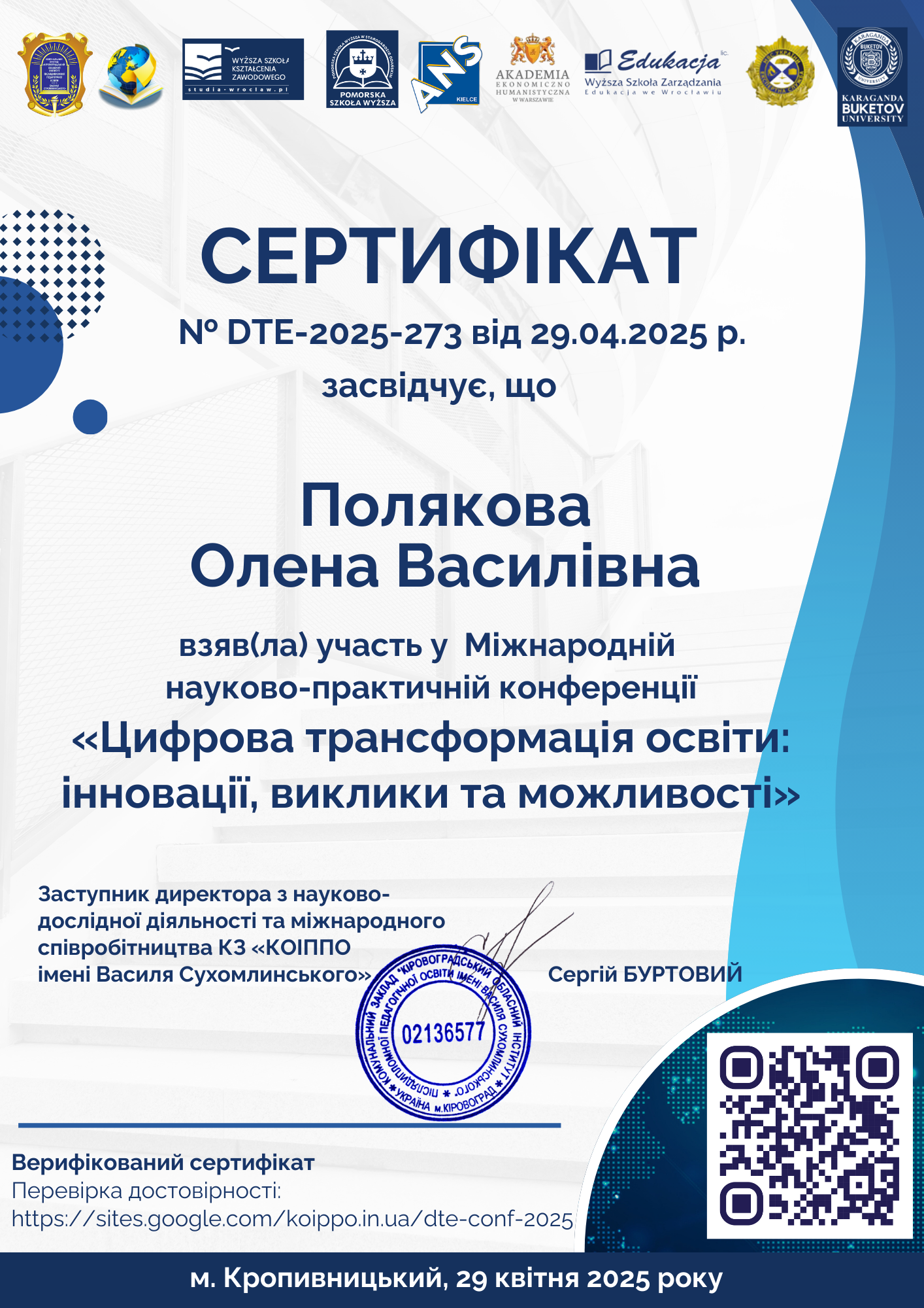 | 11830 | “Цифрова трансформація освіти: інновації, виклики, можливості" | “Партнерська взаємодія учасників освітнього процесу : безпечність та інформаційна грамотність молодших школярів.” | м. Кропивницький |