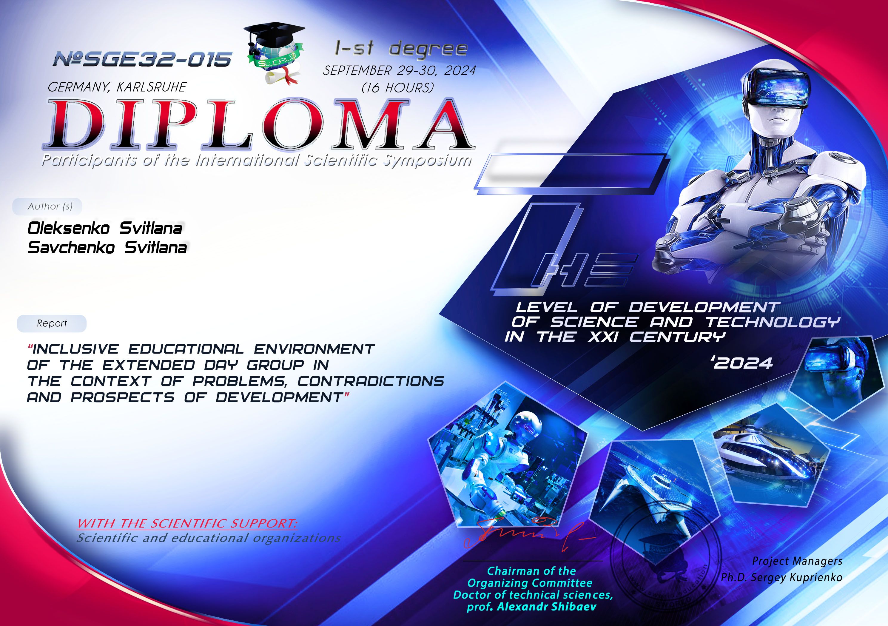 | 11494 | The level of development of science and technology in the XXI century '2024 | ICLUSIVE EDUCATIONAL ENVIRONMENT OF THE EXTENDED DAY GROUP IN THE CONTEXT OF PROBLEMS, CONFLICTS AND PROSPECTS OF DEVELOPMENT | Karlsruhe, Germany |