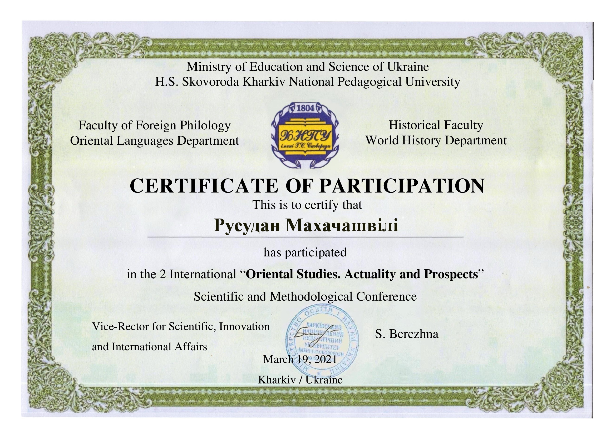 | 6628 | «ПИТАННЯ СХОДОЗНАВСТВА В УКРАЇНІ» | Universality, multipurpose and interdisciplinarity of oriental and European languages education: survey study | Харківський національний університет імені В.Н. Каразіна | document.pdf | |