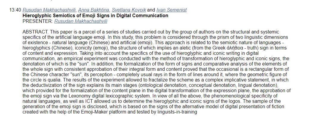 | 6745 | The International Conference on New Trends in Languages, Literature and Social Communications | Hieroglyphic Semiotics of Emoji Signs in Digital Communication | Kryviy Rih, Ukriane |