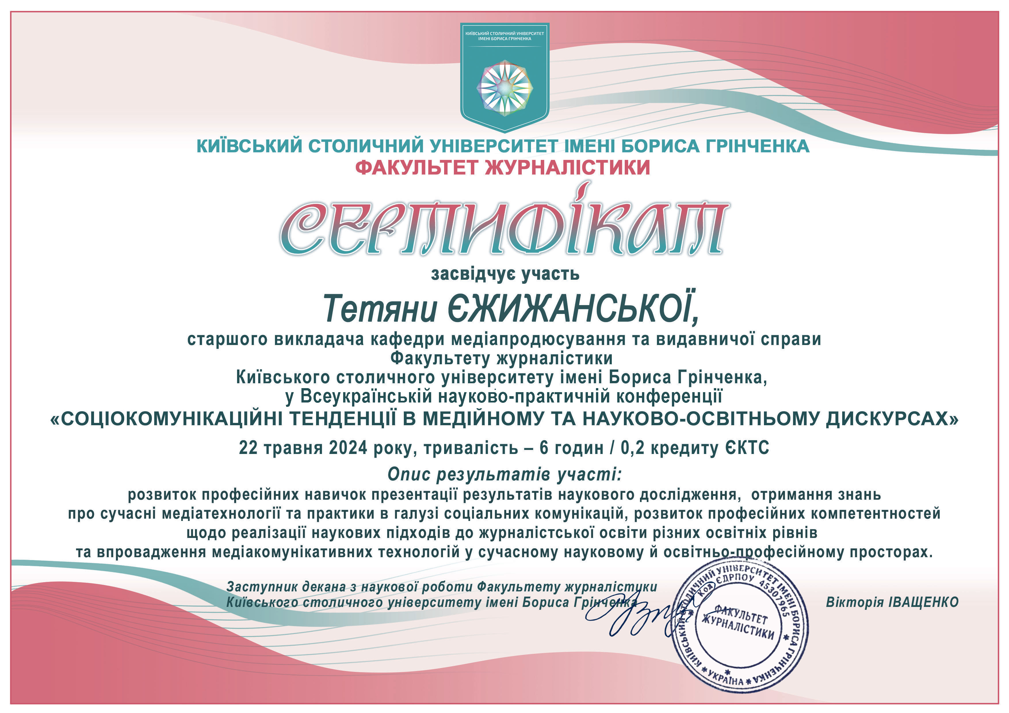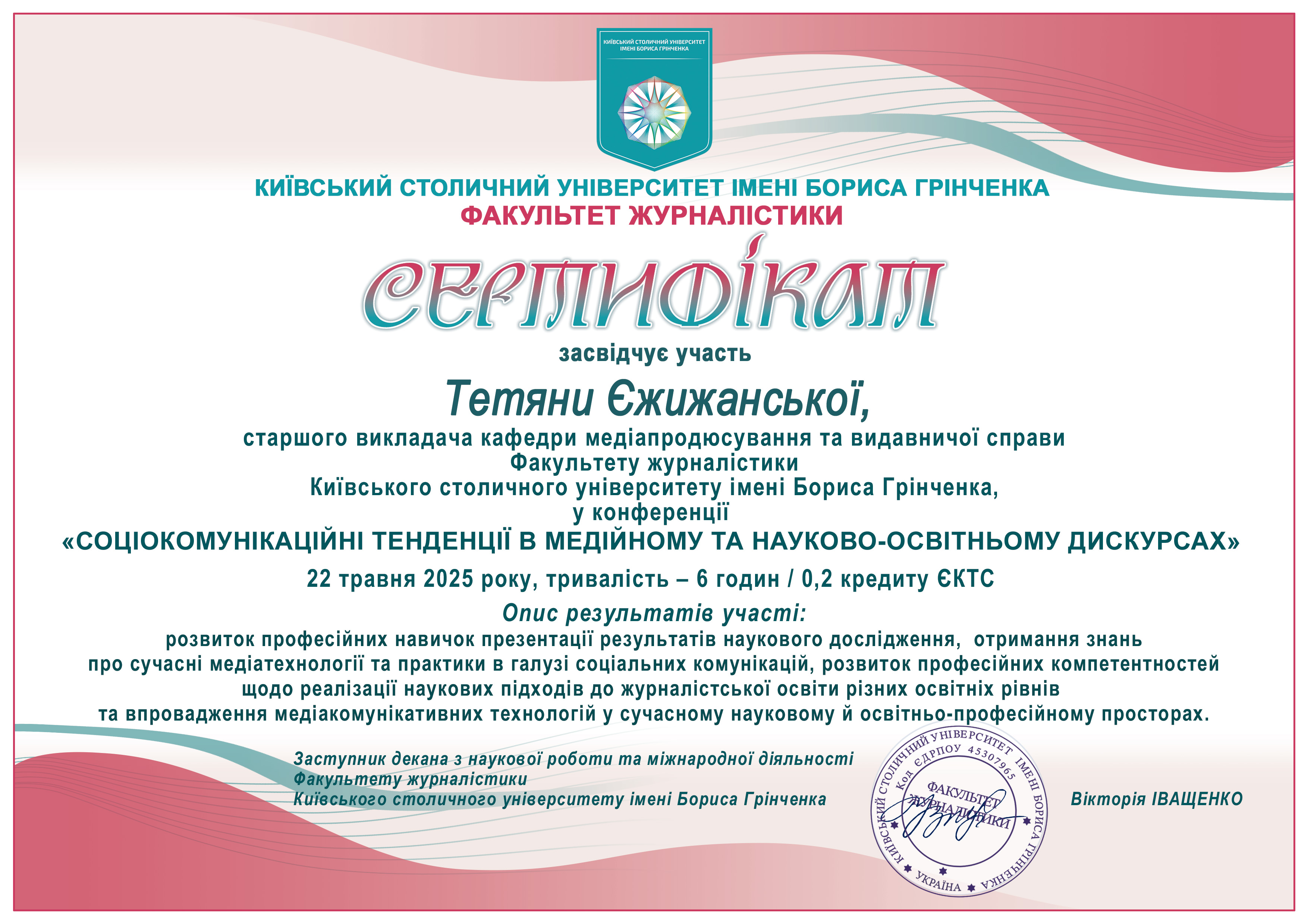 | 173 | Факультет журналістики | Кафедра медіапродюсування та видавничої справи | 41.1 | 2 | 2025 | https://www.researchgate.net/profile/Tetiana_Yezhyzhanska |