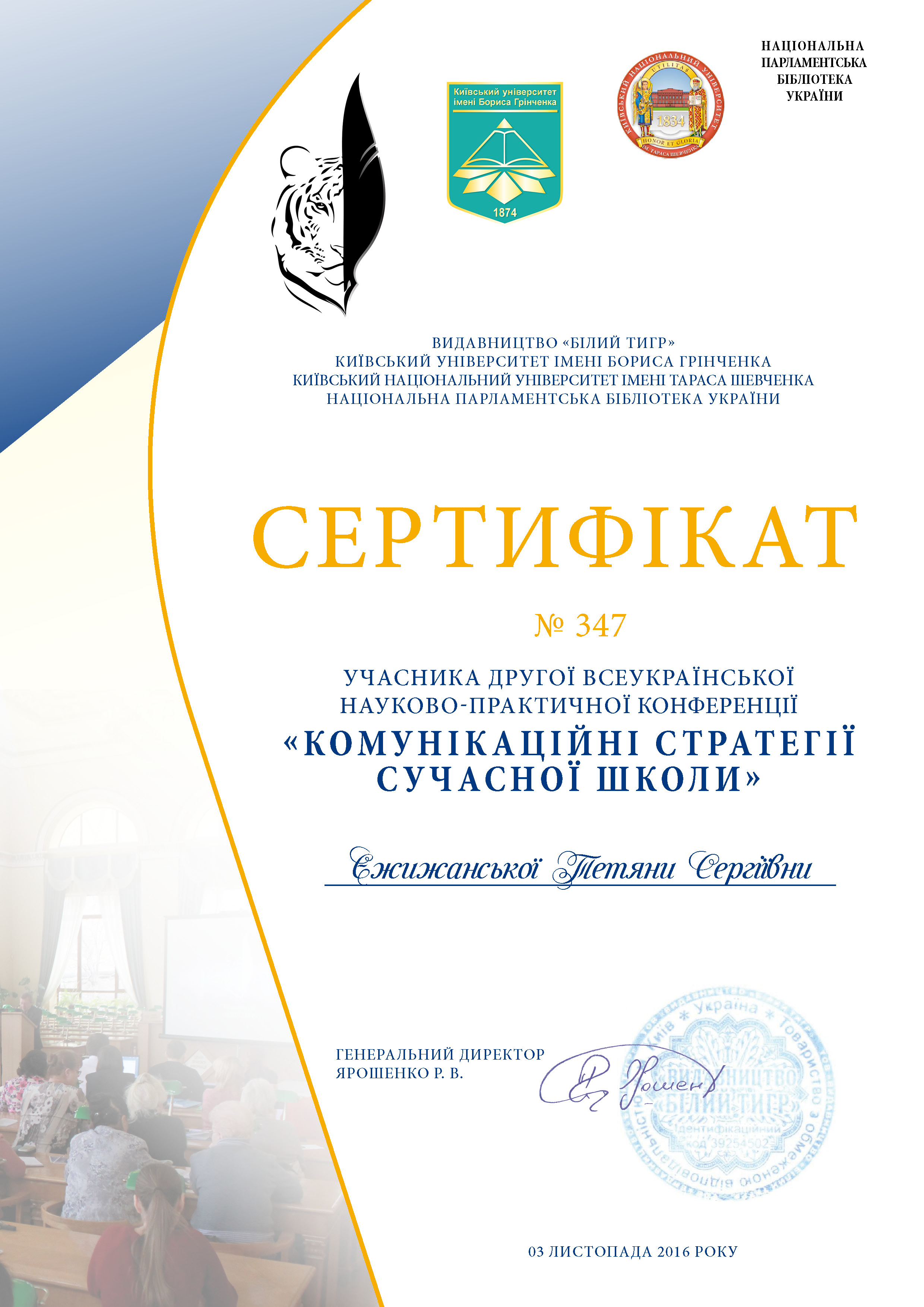 | 1150 | ІІ Всеукраїнська науково-практична конференція «Комунікаційні стратегії сучасної школи» | «Комунікаційна складова проектно-орієнтованого навчання (з досвіду викладання курсу «Редакційно-видавнича підготовка видань: художні видання») | Видавництво «Білий тигр», Інститут журналістики Київський університет імені Бориса Грінченка, Національна парламентська бібліотека України, м. Київ |