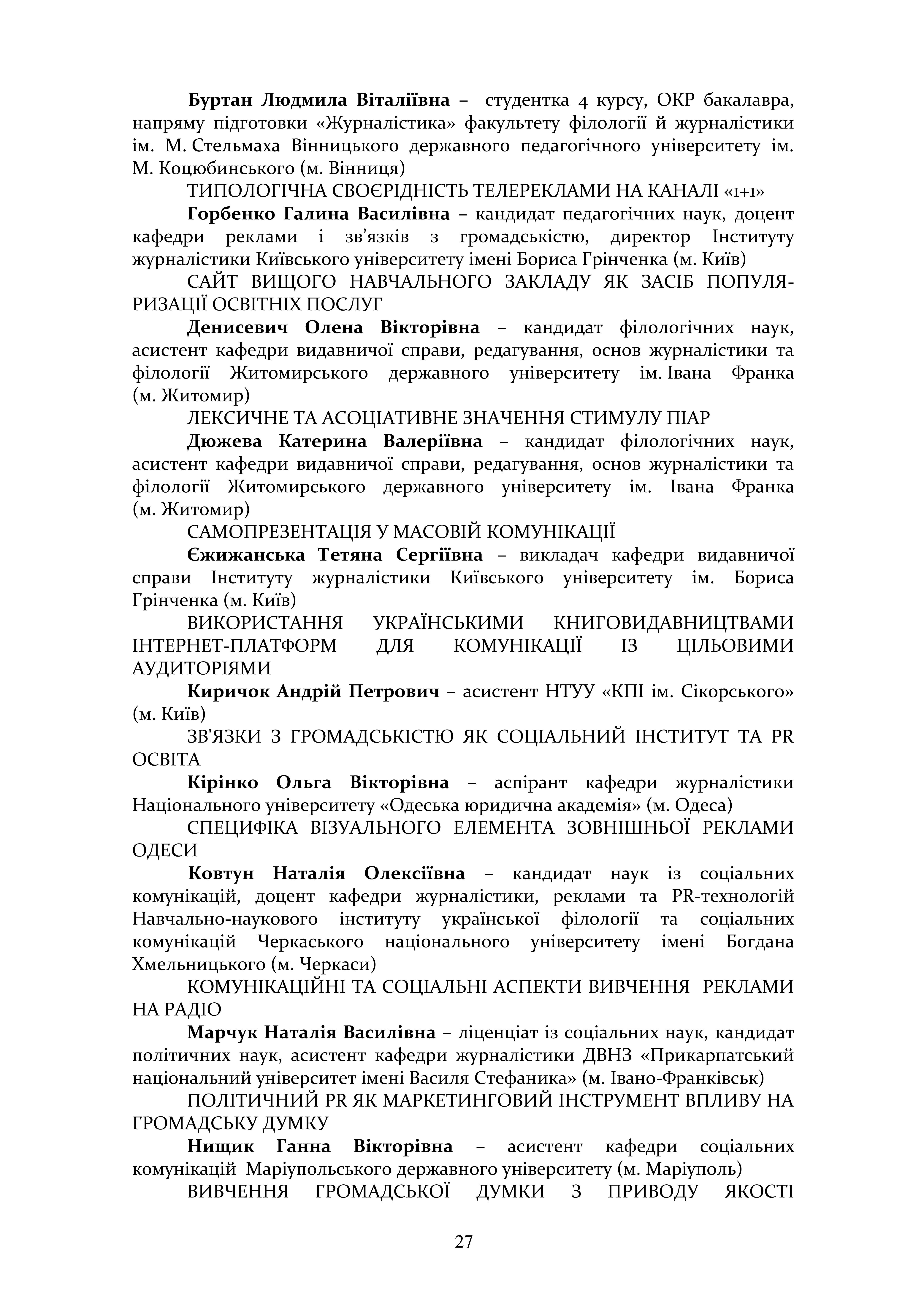 | 12652 | Всеукраїнська науково-практична конференція «Українська журналістика: вчора, сьогодні, завтра» | Медіа як канали бренд-комунікації книжкового видавництва: сучасні виклики та можливості | м. Вінниця |