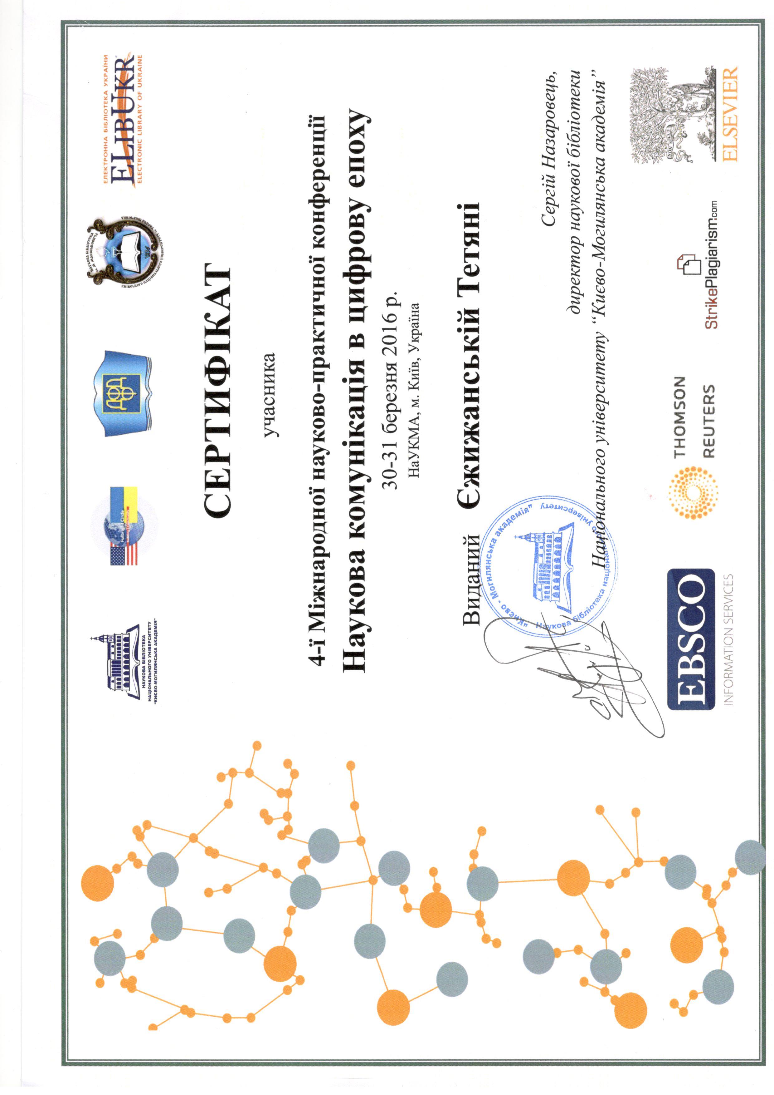 | 1153 | 4-а Міжнародна науково-практична конференція «Наукова комунікація в цифрову епоху» | Комунікація видавницт в інформаційному суспільстві | Національний університет «Києво-Могилянська академія», м. Київ |