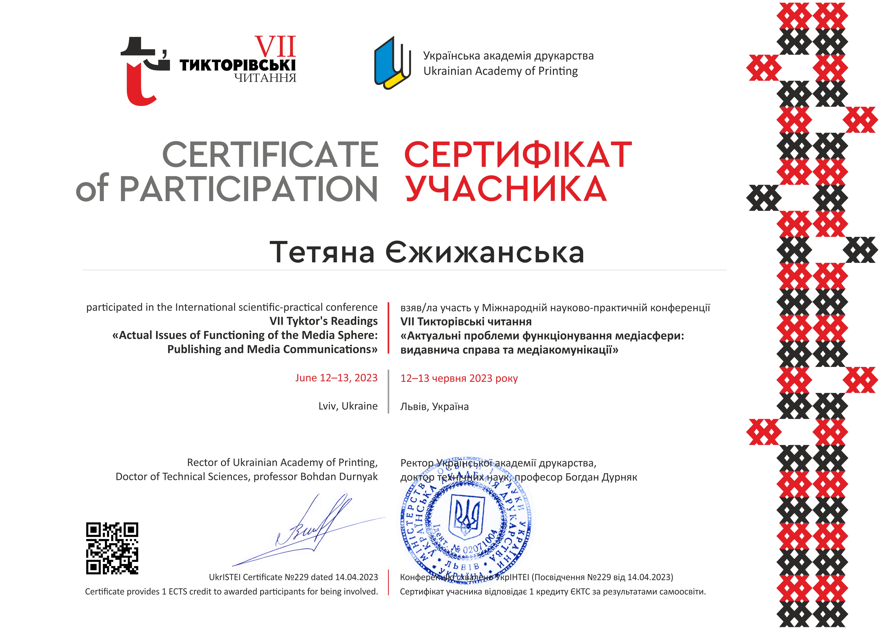 | ID | Назва | Тема доповіді | Місце проведення | Документ, що засвідчує | Дата проведення |