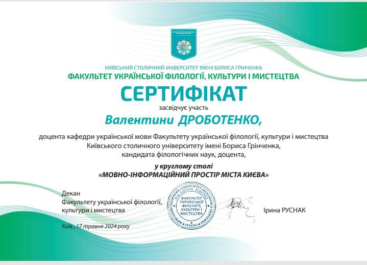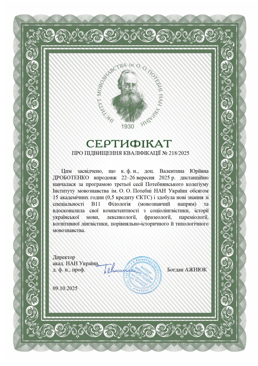 | 866 | Факультет української філології, культури і мистецтва | Кафедра української мови | 4.7 | 1 | 2025 | https://www.researchgate.net/profile/Valentyna-Drobotenko |