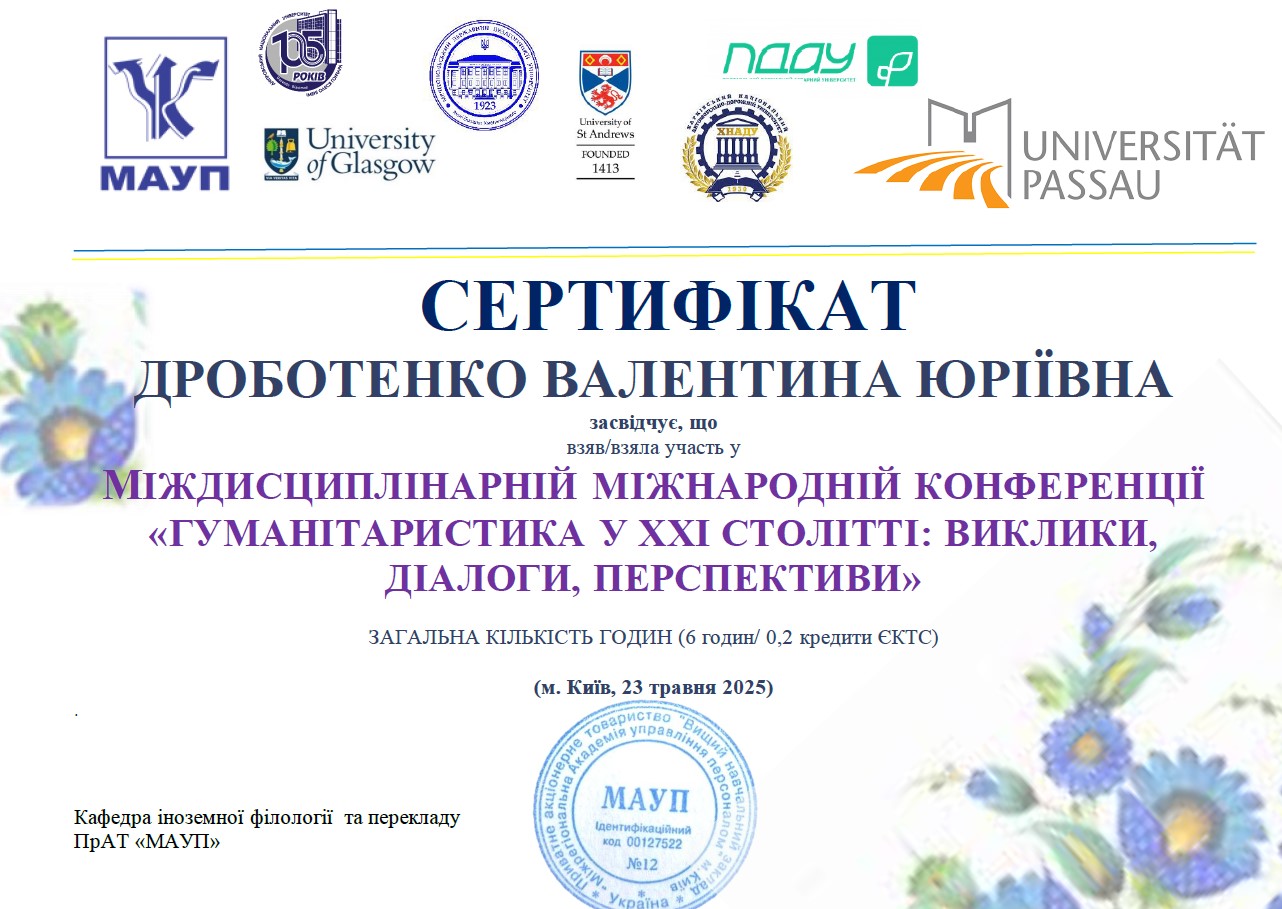| 12840 | Міждисциплінарна Міжнародна конференція «Гуманітаристика у ХХІ столітті: виклики, діалоги, перспективи» | Фразеологічна картина світу як платформа міжкультурного діалогу у ХХІ столітті | Кафедра іноземної філології та перекладу, ПрАТ «МАУП» |