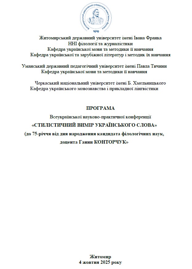 | 12841 | Всеукраїнська науково-практична конференція “Стилістичний вимір українського слова” | Фразеологічні репрезентації Києва в українській мові: стилістичний вимір | Черкаський національний університет імені Б. Хмельницького |