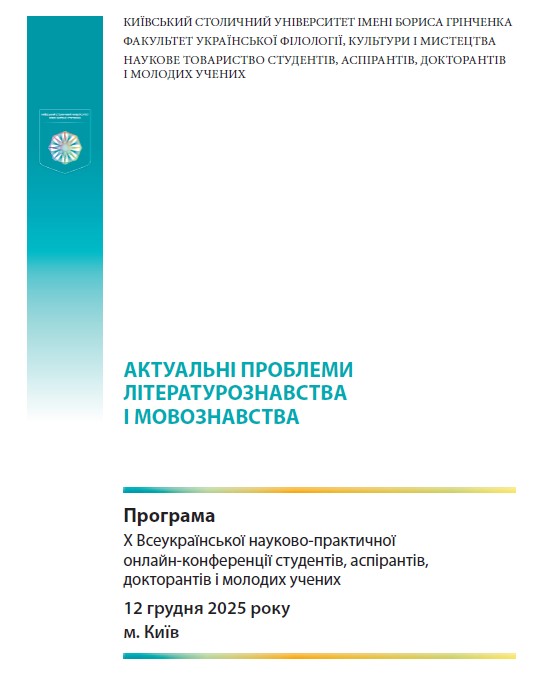 | 12844 | X Всеукраїнська науково-практична онлайн-конференція студентів, аспірантів, докторантів і молодих учених | Метафоричні образи Києва в сучасному медіадискурсі: від культурних символів до мовних інновацій | Київський столичний університет імені Бориса Грінченка |