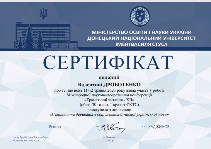 | 9720 | Міжнародна науково-теоретична конференція "Граматичні читання - XII" | Семантична деривація в соціолектах сучасної української мови | Донецький національний університет імені Василя Стуса |