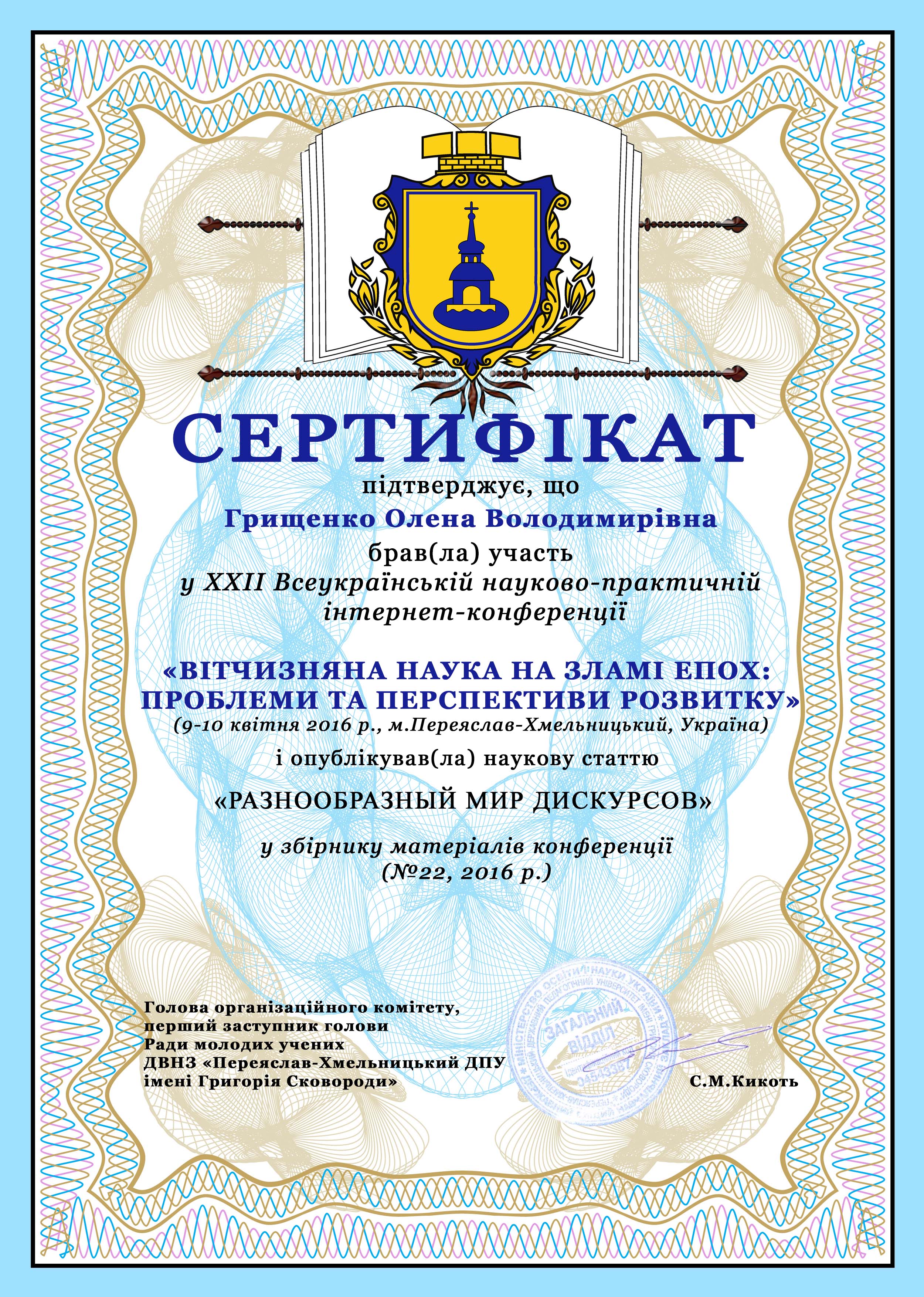 | 1134 | «Вітчизняна наука на зламі епох: проблеми та перспективи розвитку» (9 – 10 квітня 2016 р.). Зб. наук. праць. | Разнообразный мир дискурсов | Переяслав-Хмельницький |