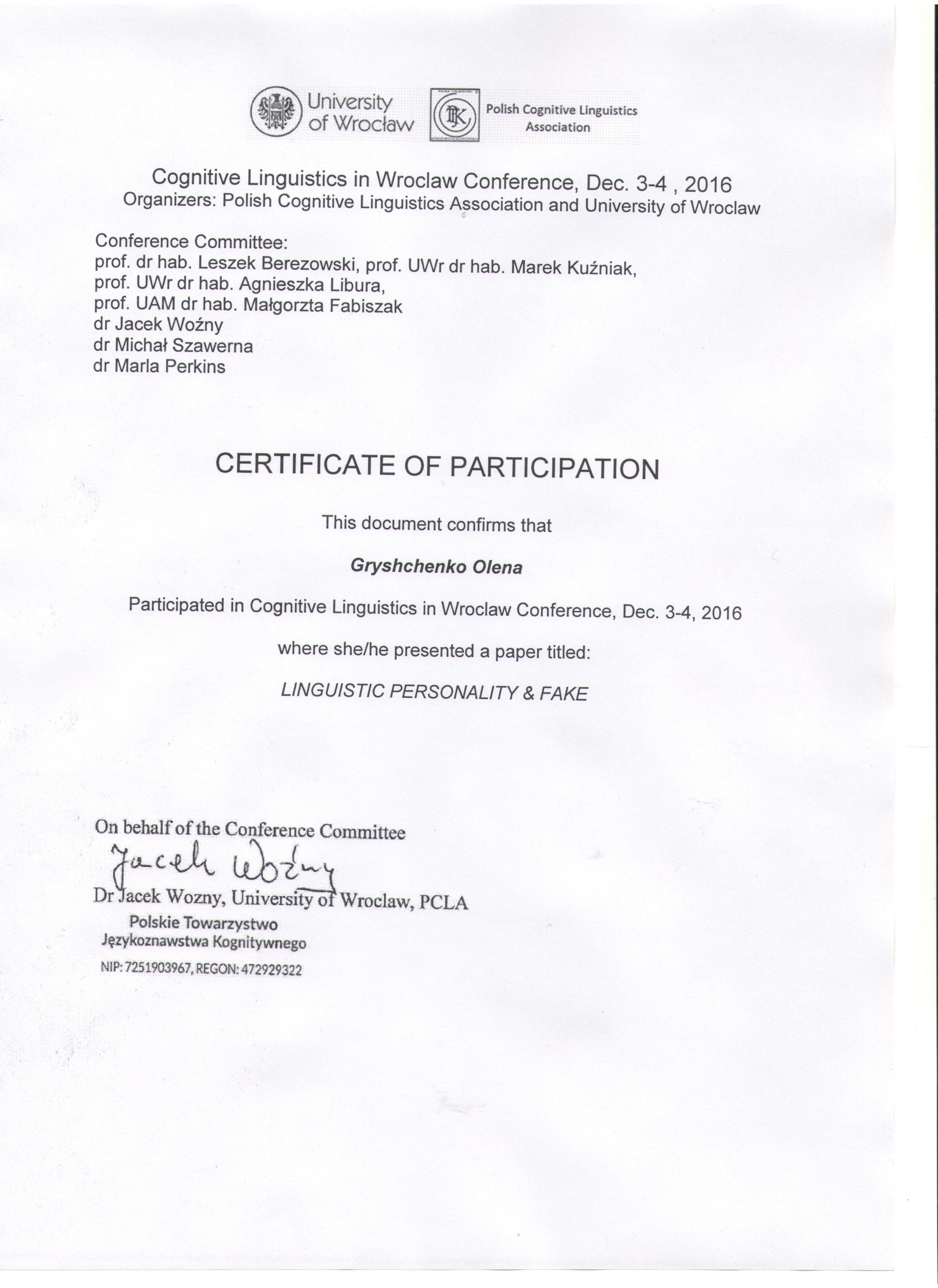 | 2391 | Cognitive Linguistics in Wroclaw Conference | Linguistic Personality and Fake | Wroclaw, on-line |