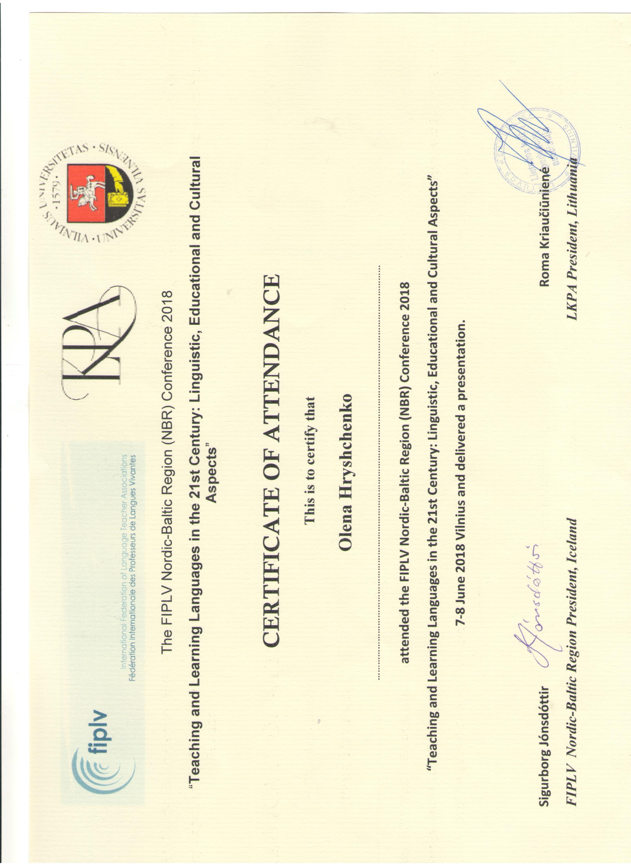 | 3233 | The FIPLV Nordic-Baltic Region Conference 2018 "Teaching and Learning Languages in the 21st Century: Linguistic, Educational and Cultural Aspects" | Modern Perception of Fake | Vilnius, Lithuania |