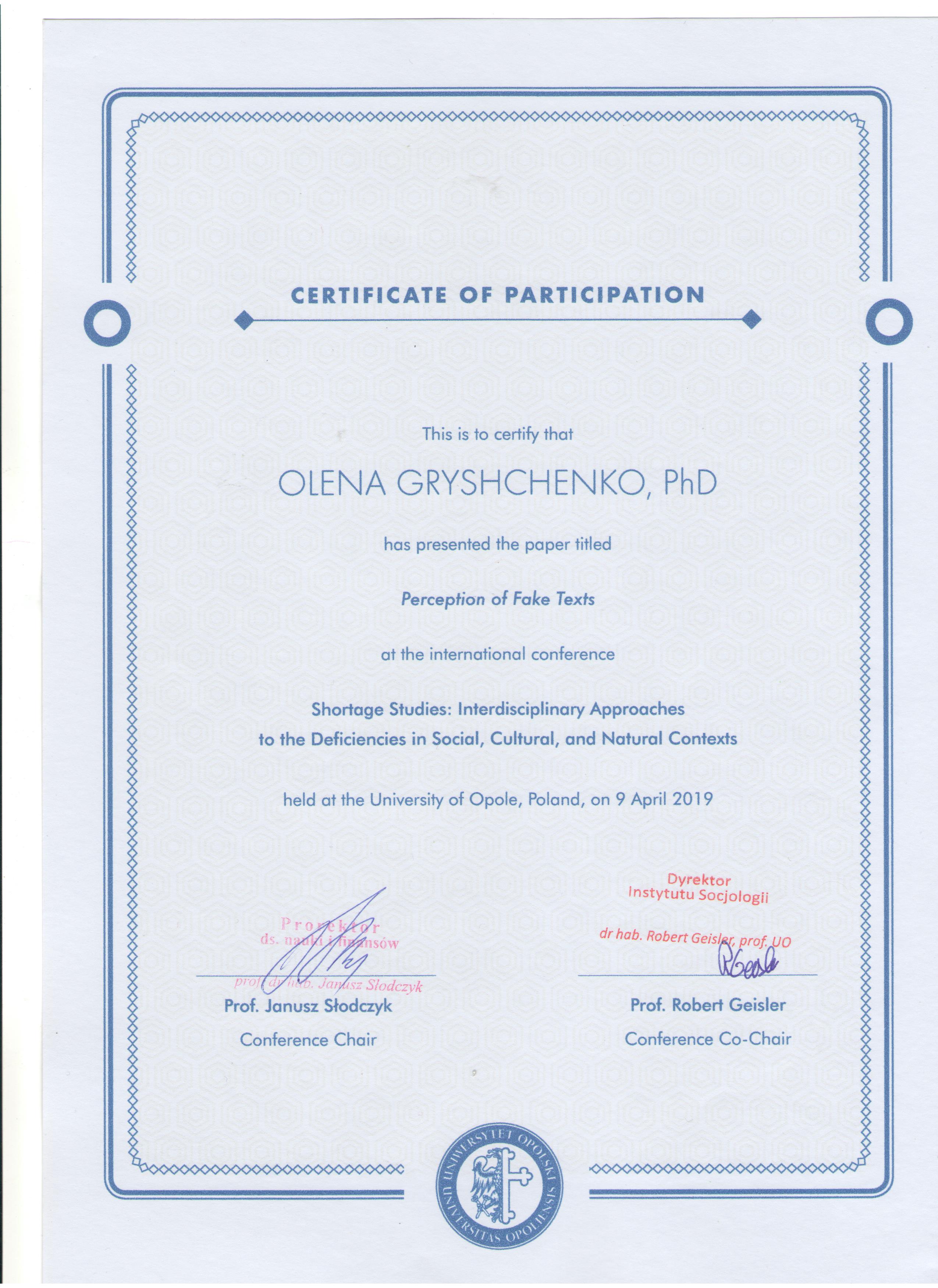 | 4145 | Shortage Studies: Interdisciplinary Approaches to the Deficiences in Social, Cultural, and Natural Contexts | Perception of Fake Texts | Opole, Poland |