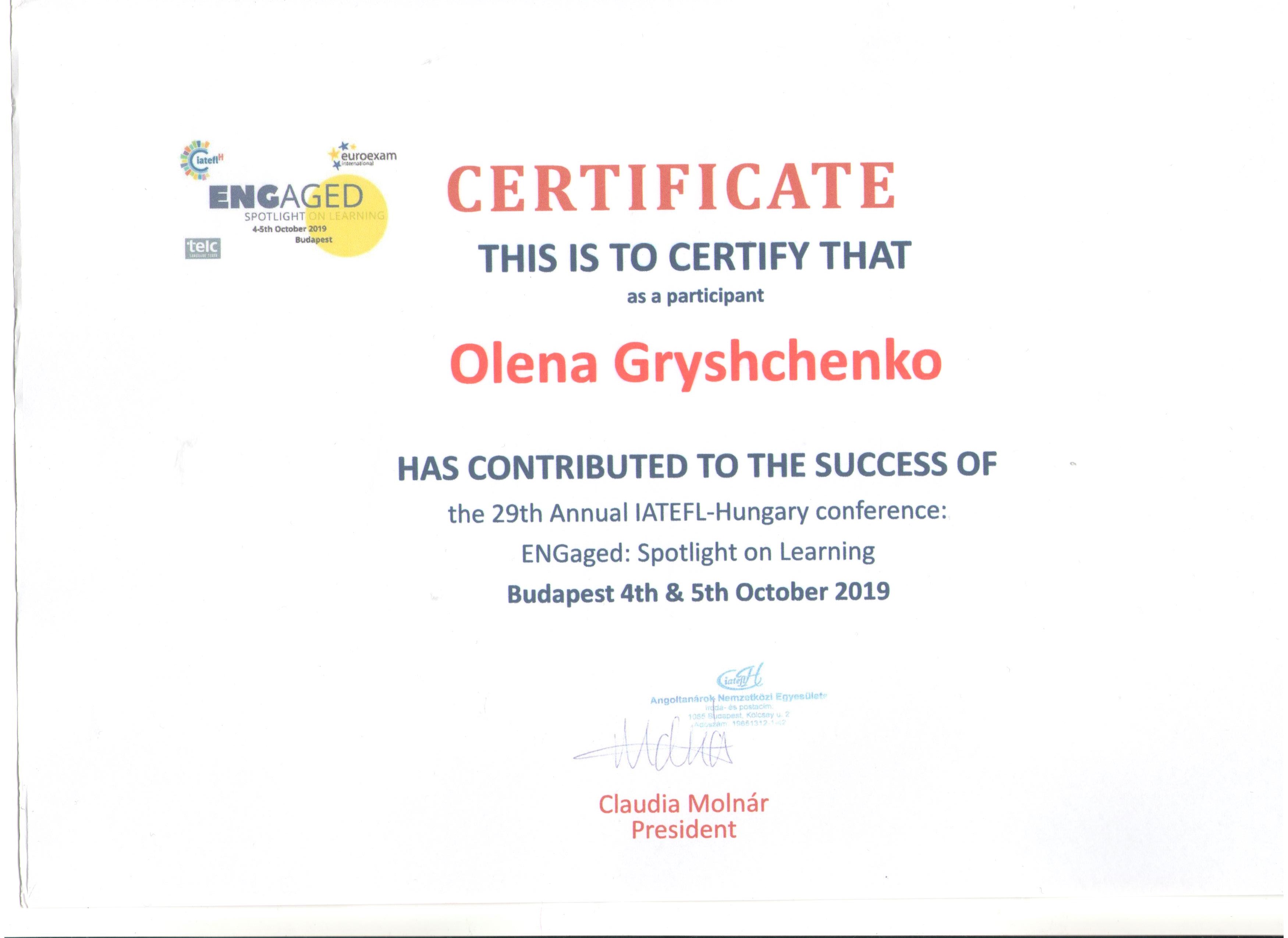 | 4448 | 29th Annual IATEFL-Hungary conference: ENGaged: Spotlight on Learning | participant | Budapest, Hungary |