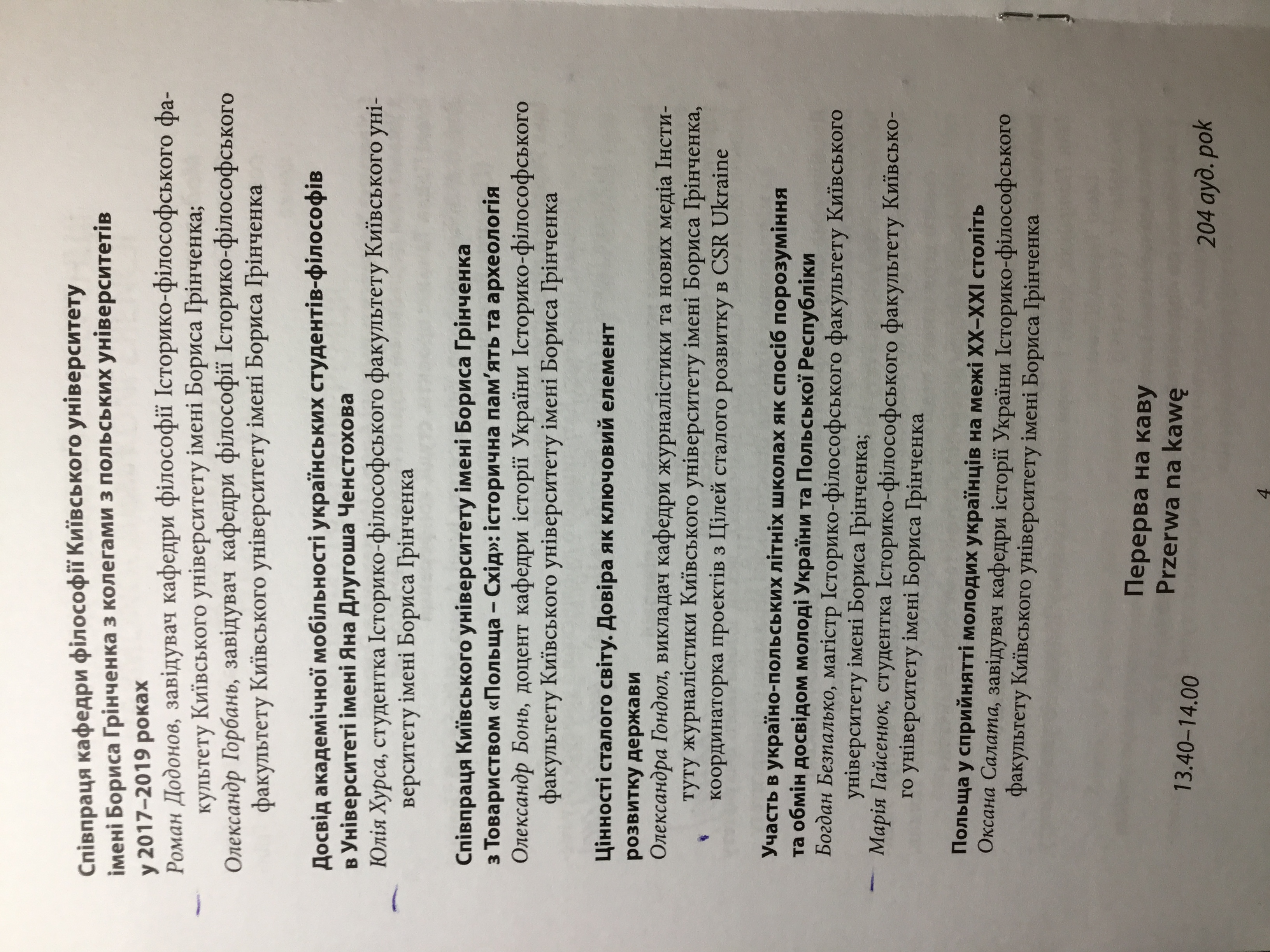 | 4902 | «УКРАЇНА І ПОЛЬЩА: ЄВРОПЕЙСЬКИЙ ДОСВІД ПОЛІКУЛЬТУРНОСТІ ТА ДОБРОСУСІДСТВА» | Співпраця Київського університету імені Бориса Грінченка з Товариством «Польща — Схід»: історична пам’ять та археологія | Київ, Київський університет імені Бориса Грінченка |