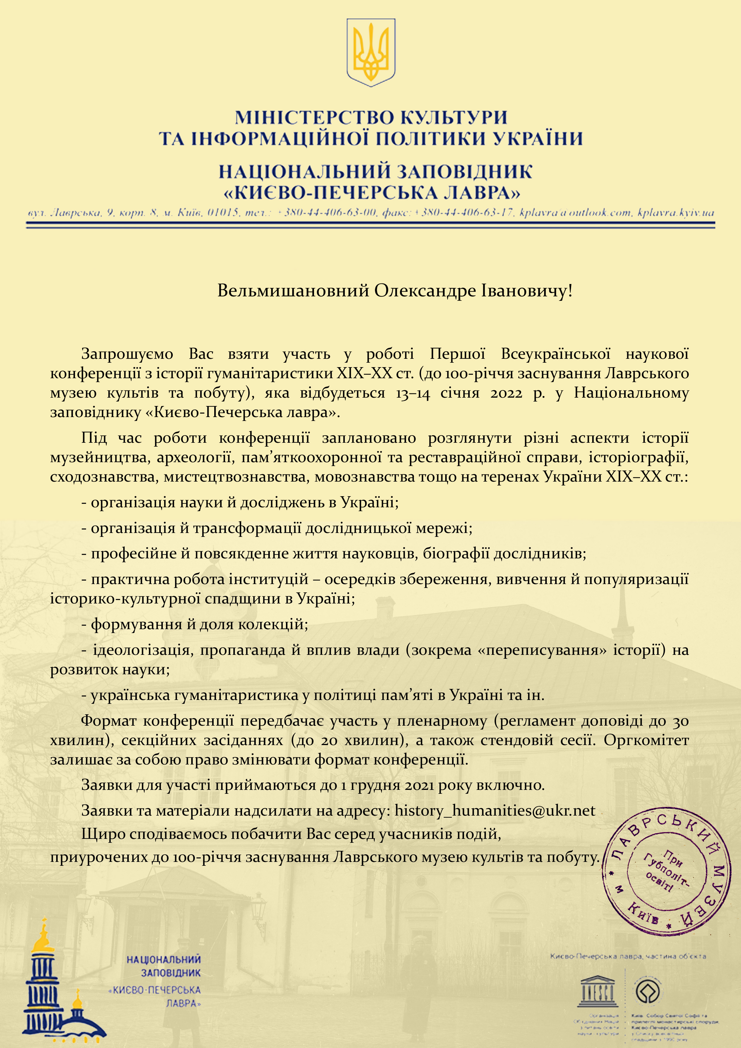 | 12756 | Четверта Всеукраїнська наукова конференція з історії гуманітаристики ІСТОРІЯ ГУМАНІТАРИСТИКИ ХІХ–ХХІ ст.: ОПІКА КОЛЕКЦІЯМИ (до 185-річчя від дня народження Миколи Петрова) | Взяття під контроль більшовицьким режимом українського літературно-мистецького середовища у 1920 роках. | Київ, НАЦІОНАЛЬНИЙ ЗАПОВІДНИК “КИЄВО-ПЕЧЕРСЬКА ЛАВРА” | document.pdf | |