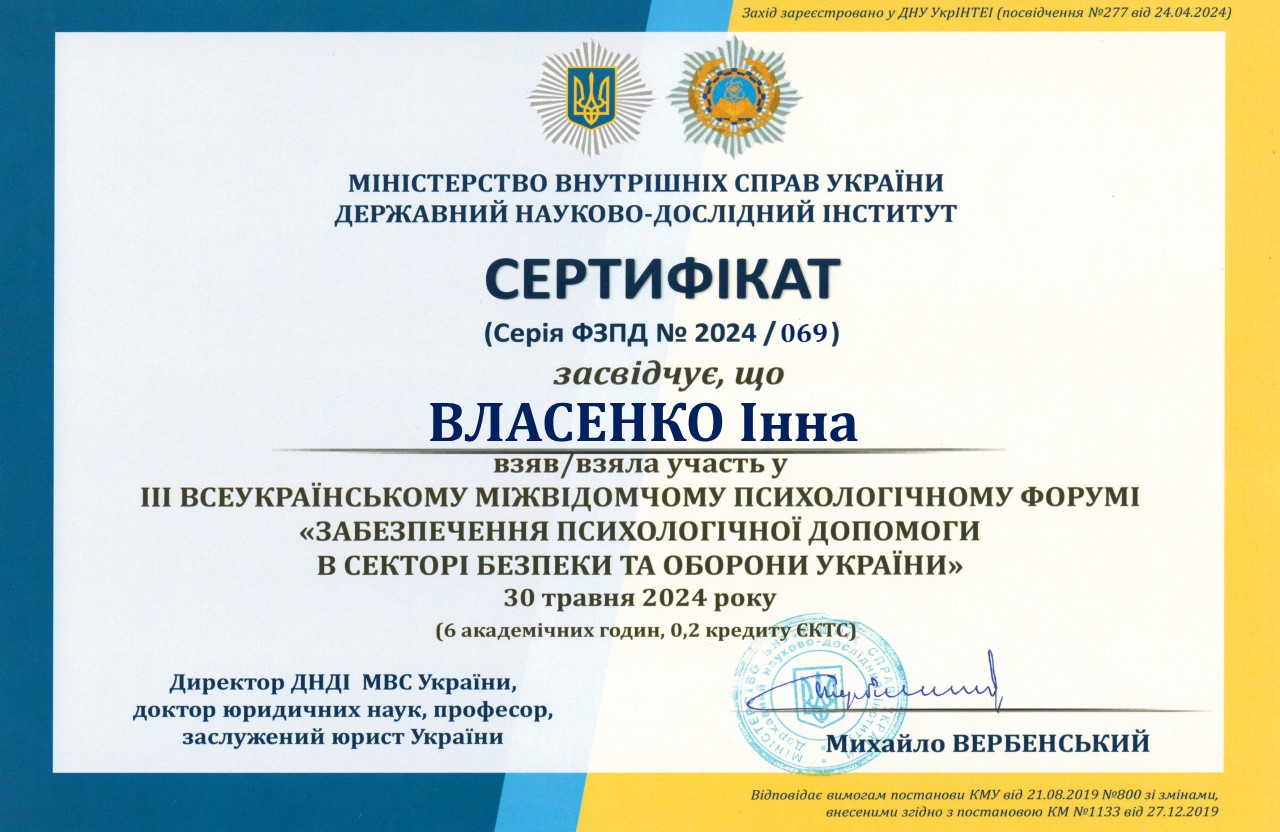 | 11130 | ІІІ Всеукраїнський міжвідомчий психологічний форум "Забезпечення психологічної допомоги в секторі безпеки та оборони України" | Психологічна допомога дружинам учасників бойових дій | М. Київ |