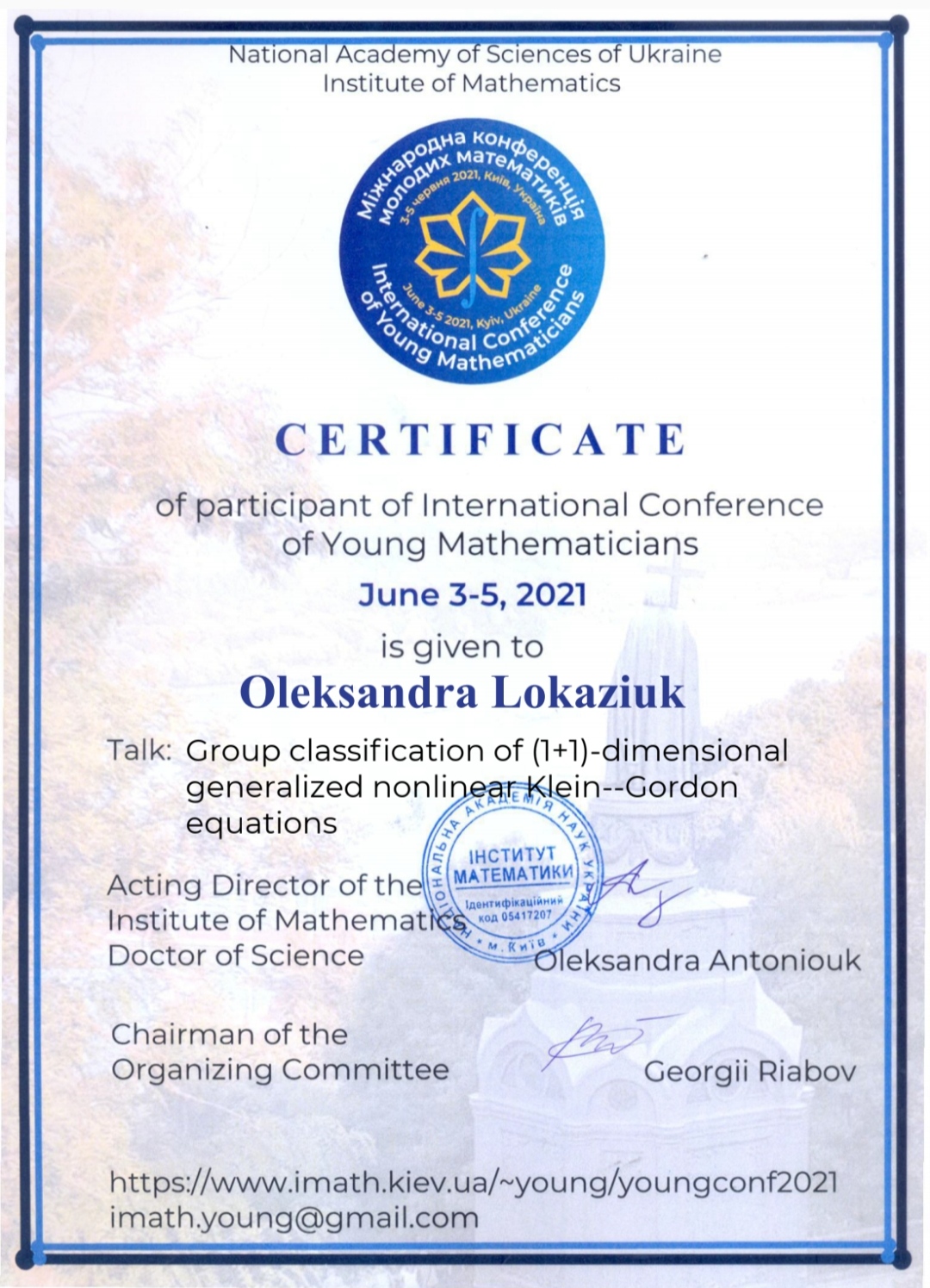 Інститут математики НАН України, доктор філософії в галузі математики.