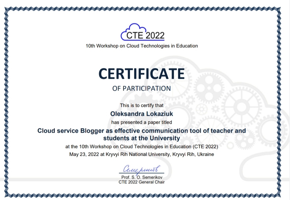 8124 10th Workshop on Cloud Technologies in Education (СТE 2022) Cloud service Blogger as effective communication tool of teacher and students at the University Криворізький державний педагогічний університет. document