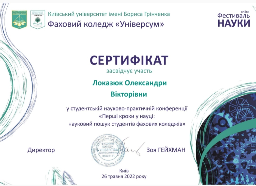 61 ІІ Всеукраїнська студентська науково-практична конференція "Перші кроки у науці: науковий пошук студентів фахових коледжів" Гаращенко Дарина Ярославівна 2024 Всеукраїнський рівень Покликання