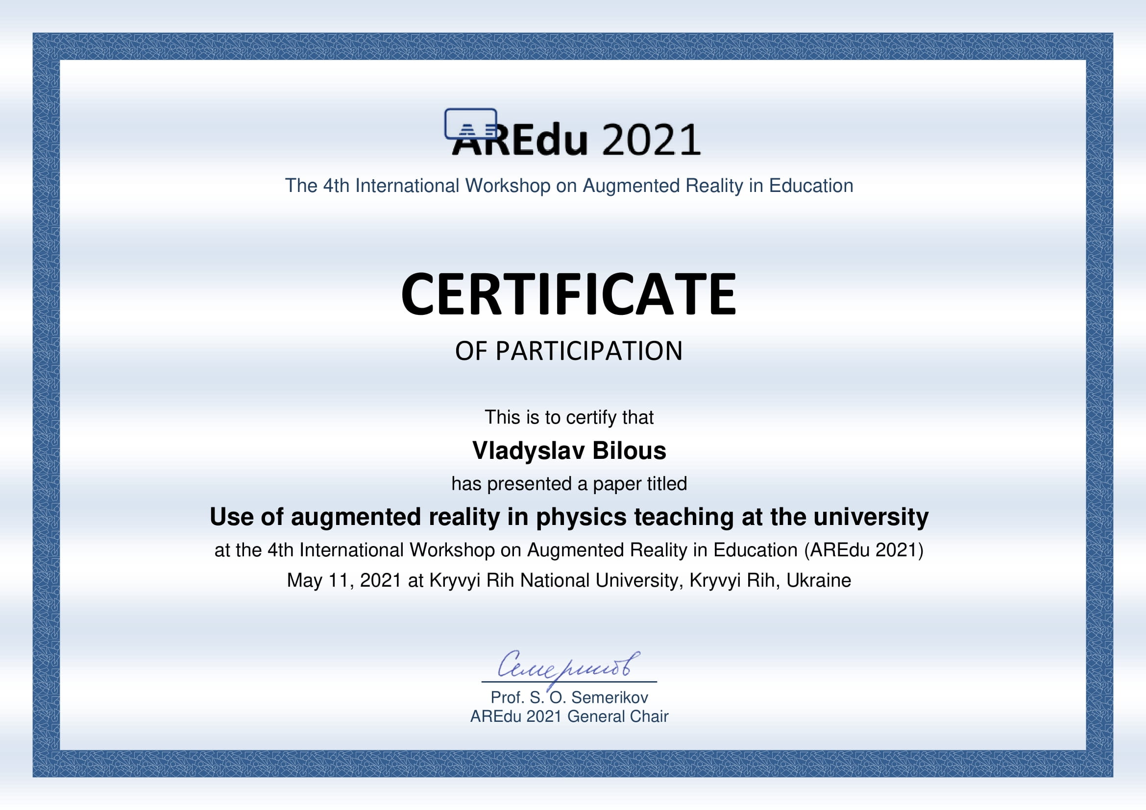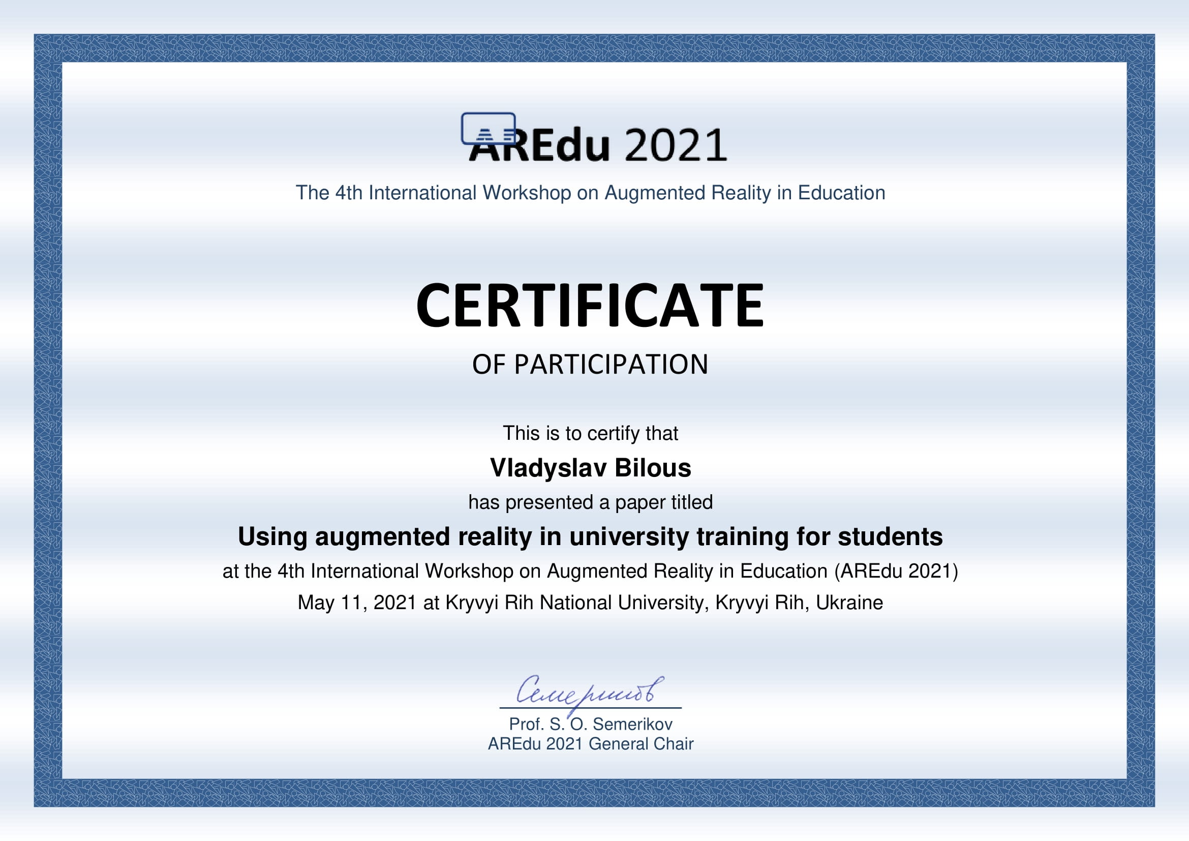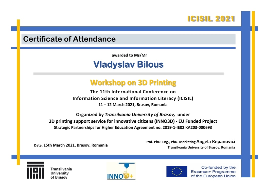 В 2020 році, закінчив курс спеціалізації “Virtual Reality” в University of London, Goldsmiths University of London
