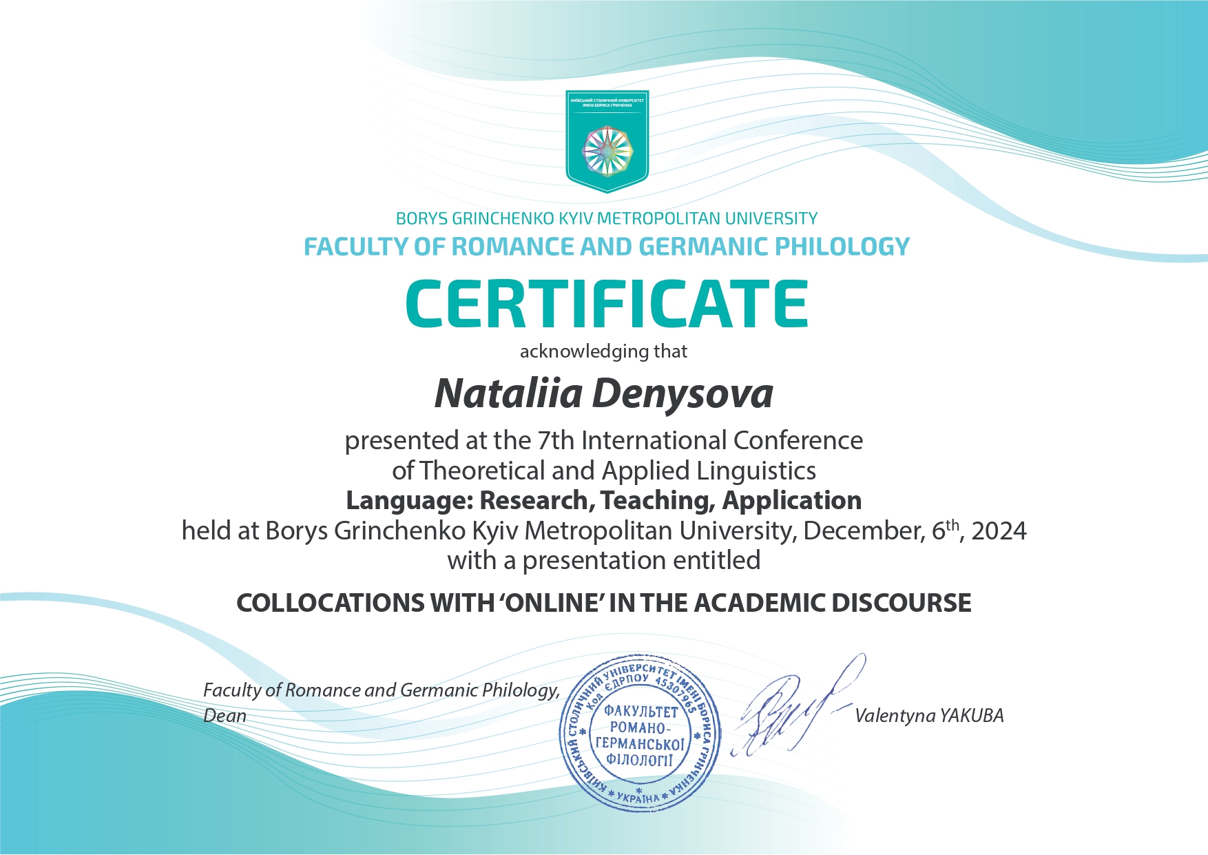 | 11558 | The 7th International Conference of Theoretical and Applied Linguistics Language: Research, Teaching, Application | COLLOCATIONS WITH ‘ONLINE’ IN THE ACADEMIC DISCOURSE | Borys Grinchenko Kyiv Metropolitan University |