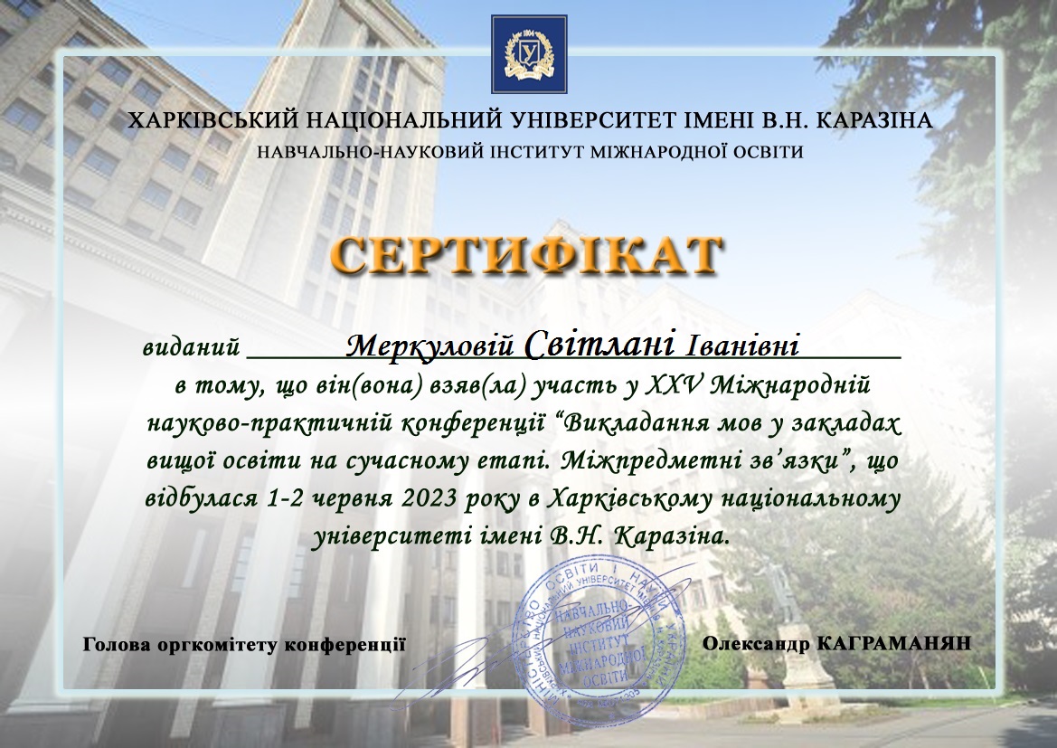 | 7115 | Фаховий модуль (стажування) | Фаховий модуль (за кордоном) | Certificate_Svitlana Merkulova.pdf | 18.11.2022 00:00 |