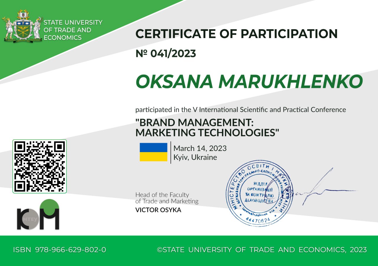 | 9137 | Бренд-менеджмент: маркетингові технології | Тренди формування й розвитку бренд-менеджменту України в умовах воєнного стану | Київ |