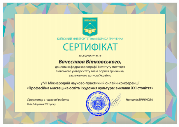 | 6779 | VІI Міжнародній науково-практичній онлайн-конференції «Професійна мистецька освіта і художня культура: виклики ХХІ століття» | «Пластично хореографічне рішення сучасної музичної вистави» | м.Київ |
