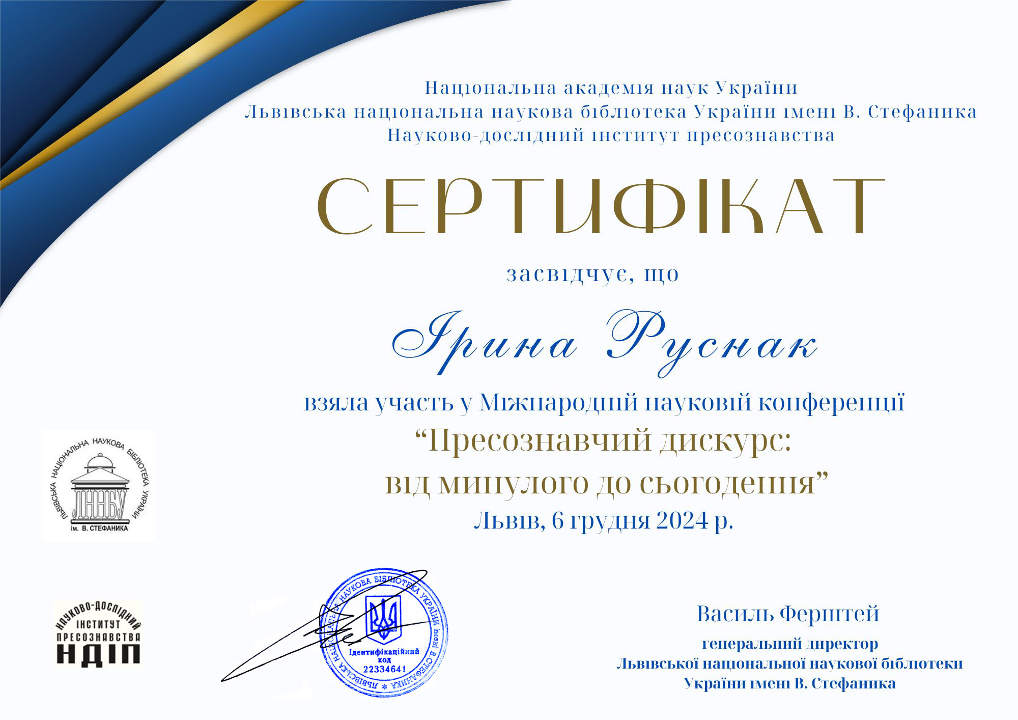 | ID | Назва | Тема доповіді | Місце проведення | Документ, що засвідчує | Дата проведення |