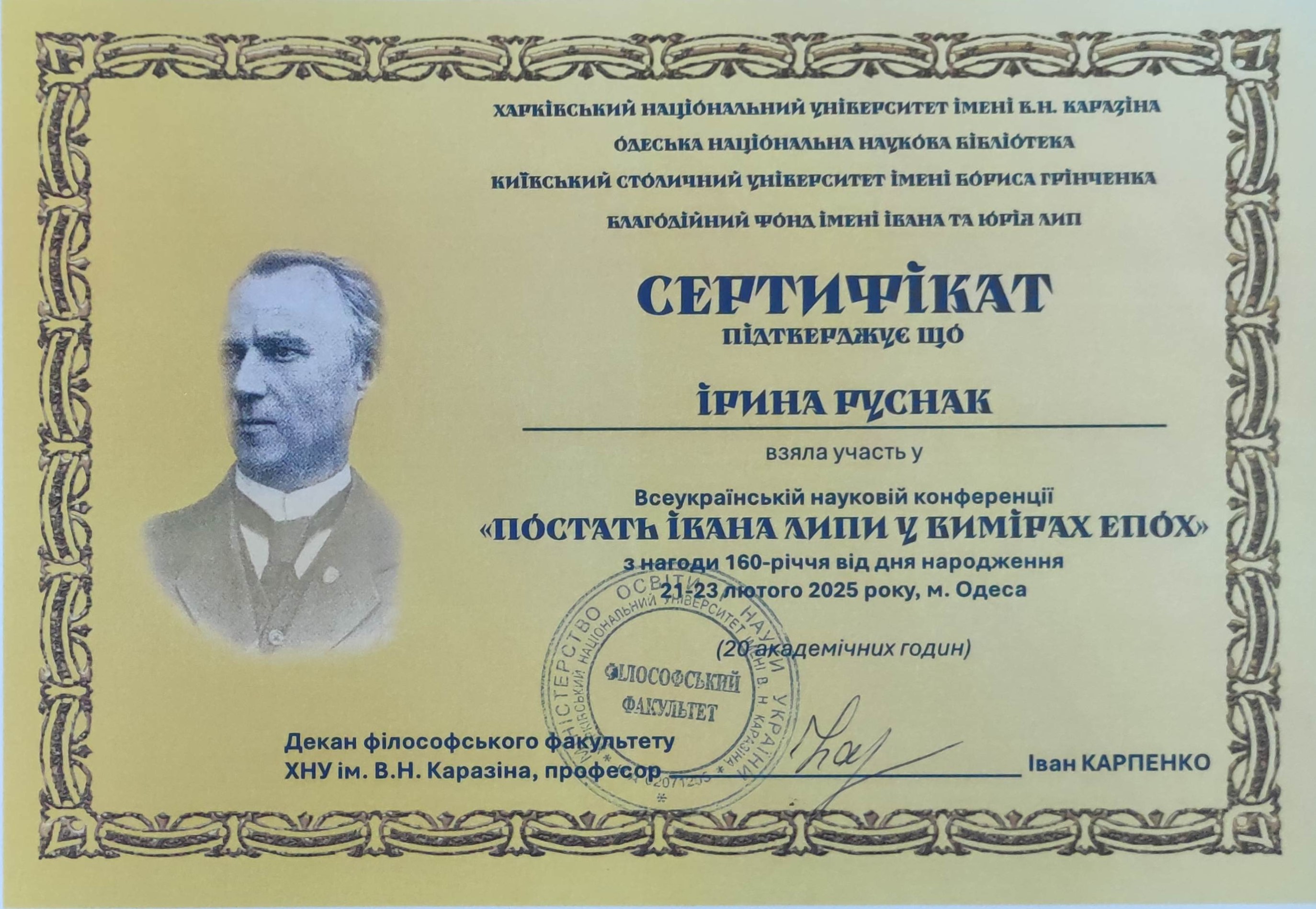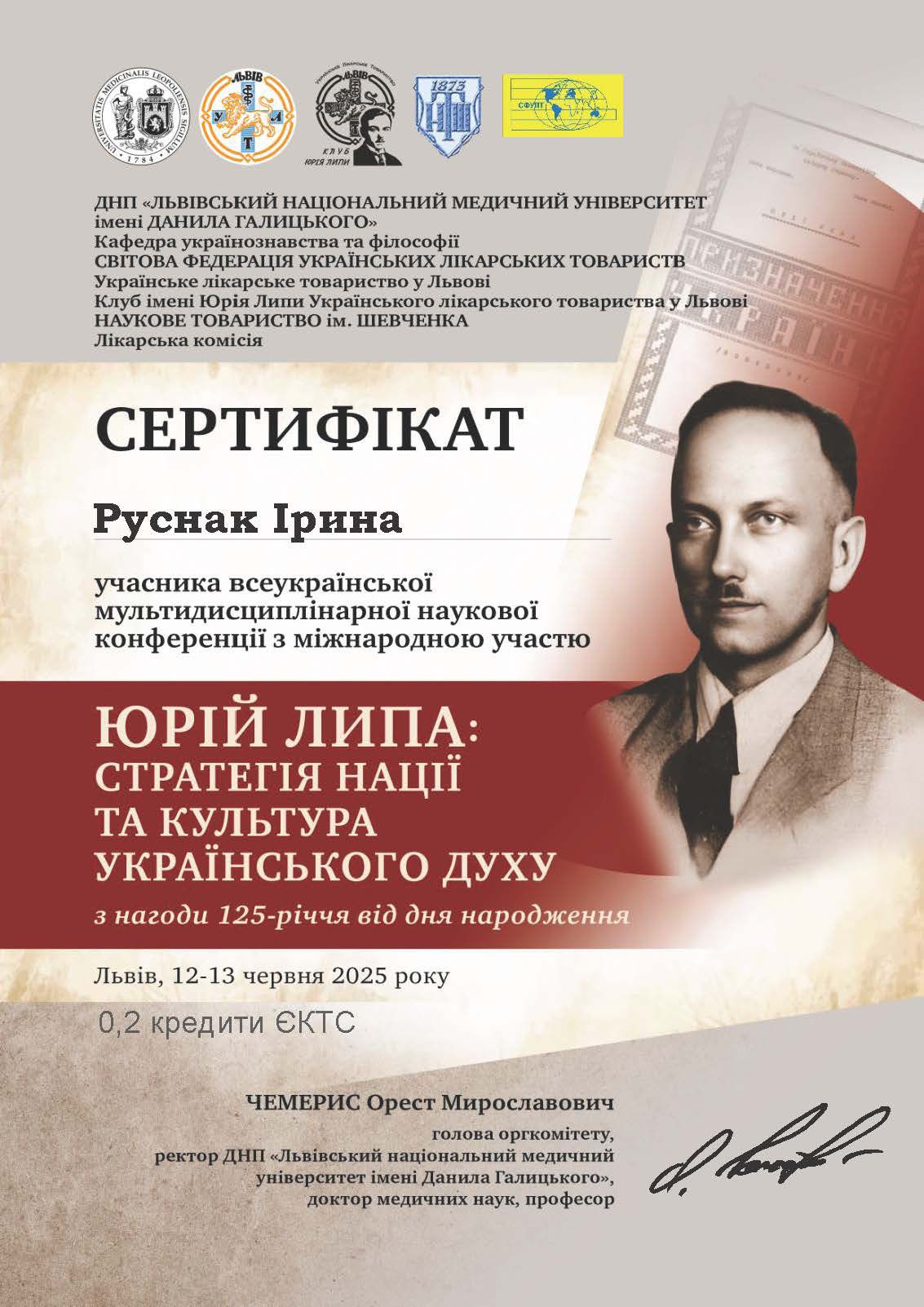 | 12024 | ЮРІЙ ЛИПА: СТРАТЕГІЯ НАЦІЇ ТА КУЛЬТУРА УКРАЇНСЬКОГО ДУХУ | Образ українського духовного проповідника в художньому нарисі «Петлюра» (1937) Юрія Липи» | Львівський національний медичний університет імені Данила Галицького |