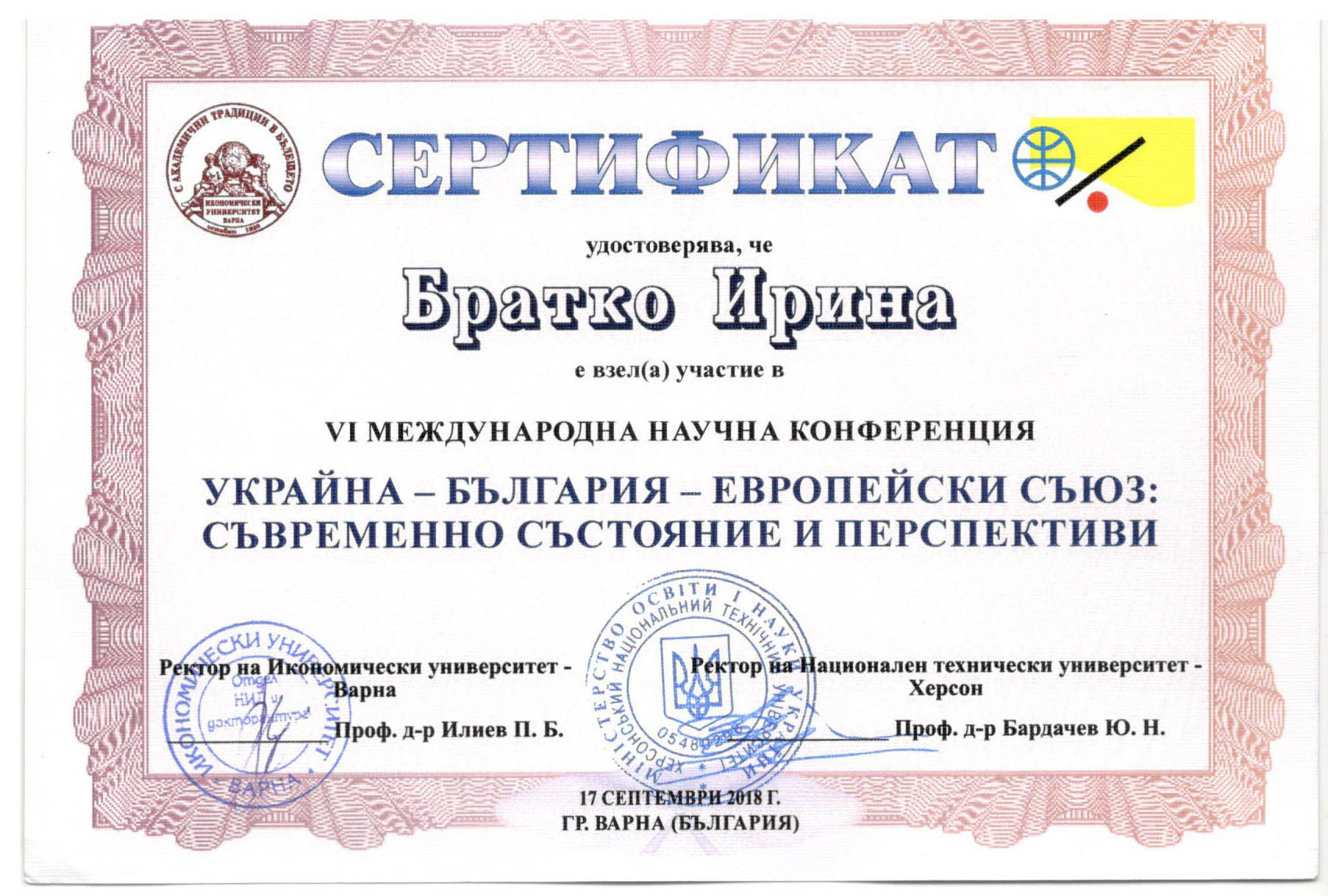 | 4001 | VI международна научна конференция (болг.)"Украйна-България - Европейски Съюз: съвременносъстояние и перспективи" | Международно-правовые аспекты украино-болгарских отношений в контексте европейской интеграции | м.Варна (Болгария) |
