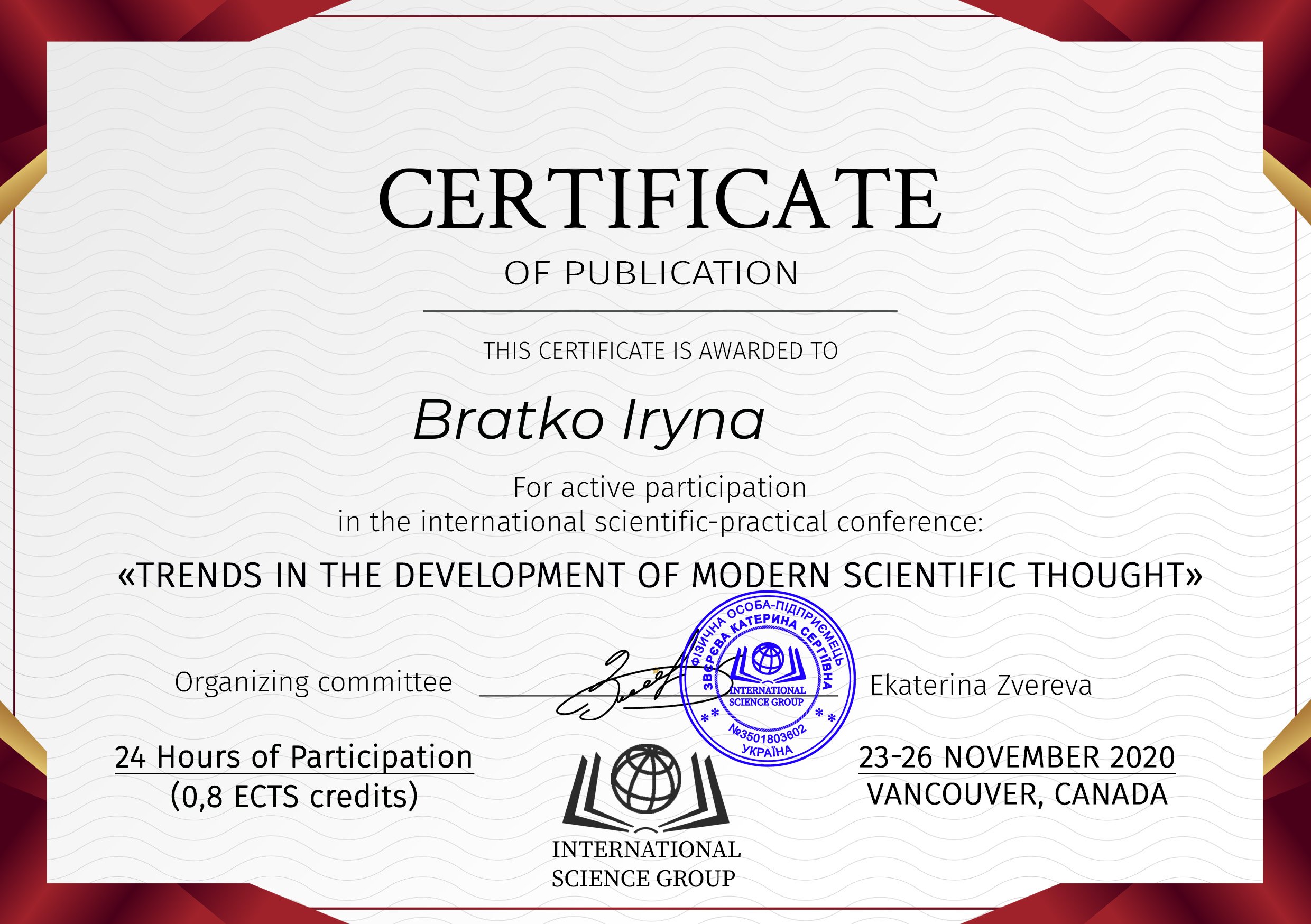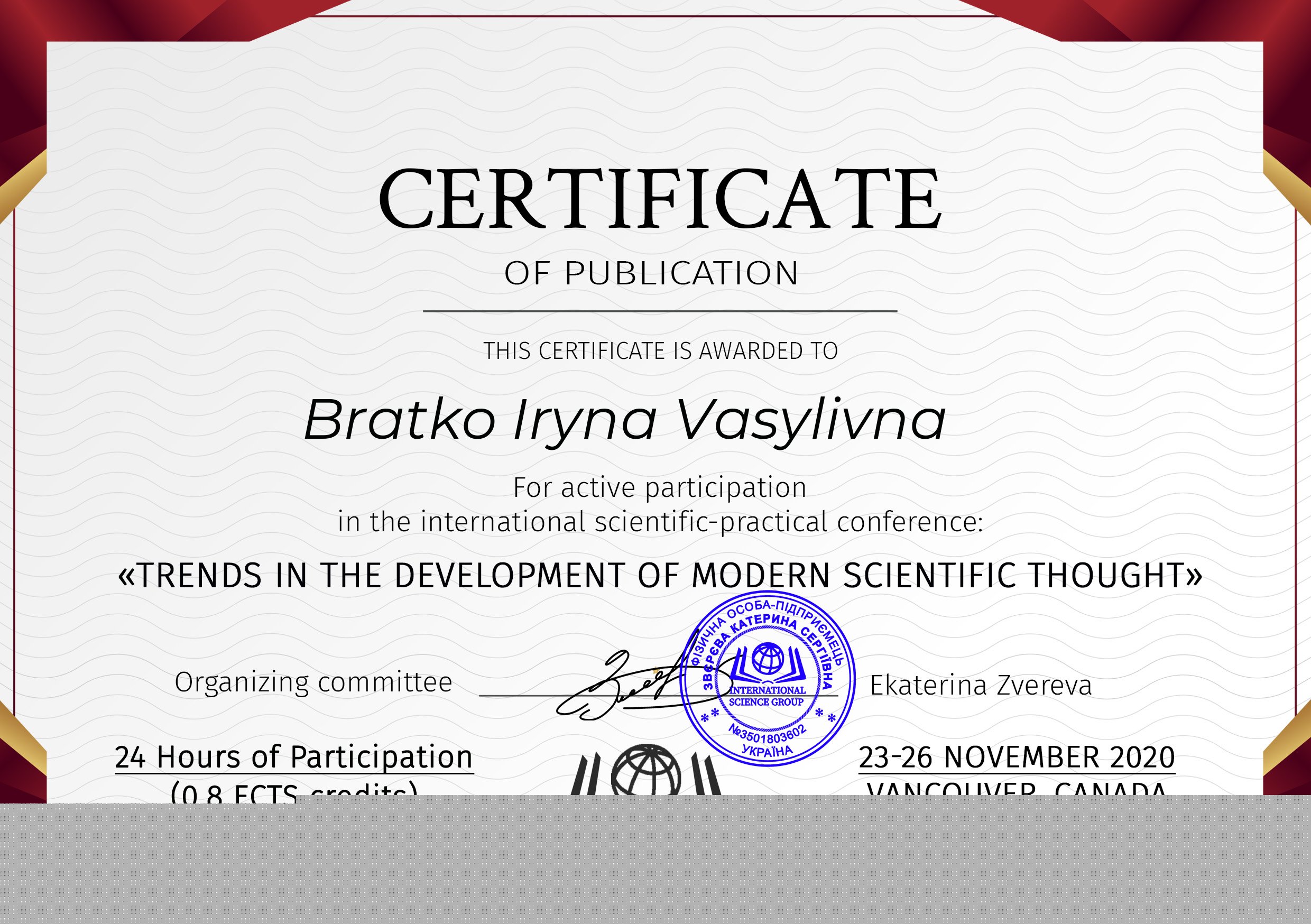 | 5962 | X Міжнародна науково -практична конференція “Trends in the development of modern scientific thought” | Bratko Iryna, Kushevska Natalia THE EXPERIENCE OF DISTANCE AND VIRTUAL TEACHING IN THE PANDEMIC PERIOD | Ванкувер, Канада, 23-26 листопада 2020 р. |