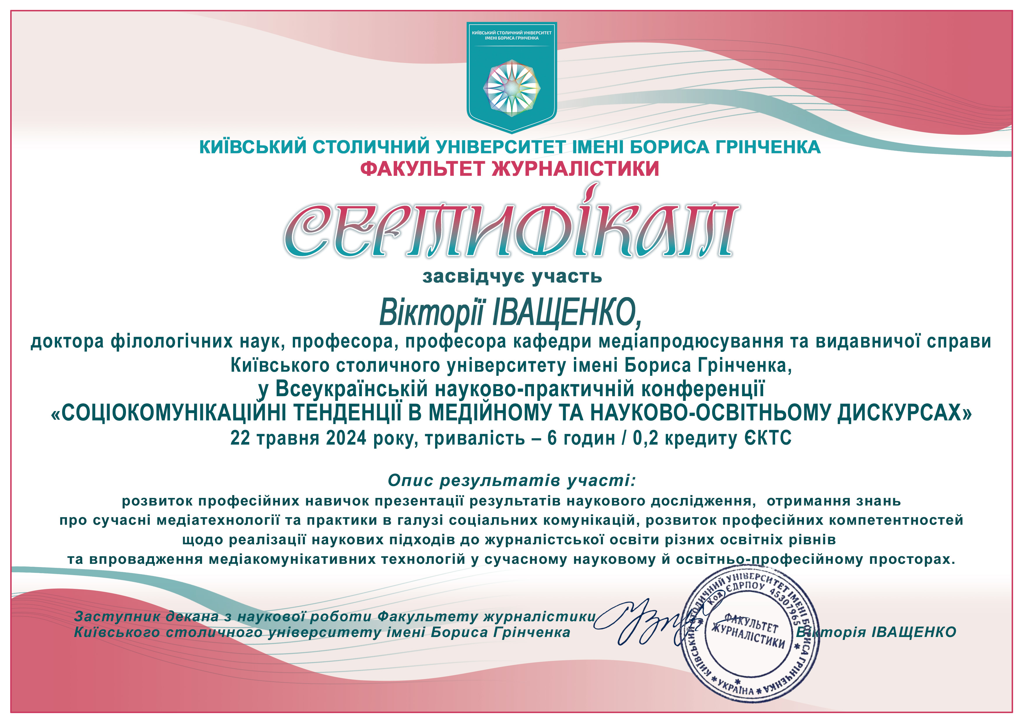 | 167 | Факультет журналістики | Кафедра медіапродюсування та видавничої справи | 96.4 | 2 | 2025 | https://www.researchgate.net/profile/Victoria_Ivashchenko |