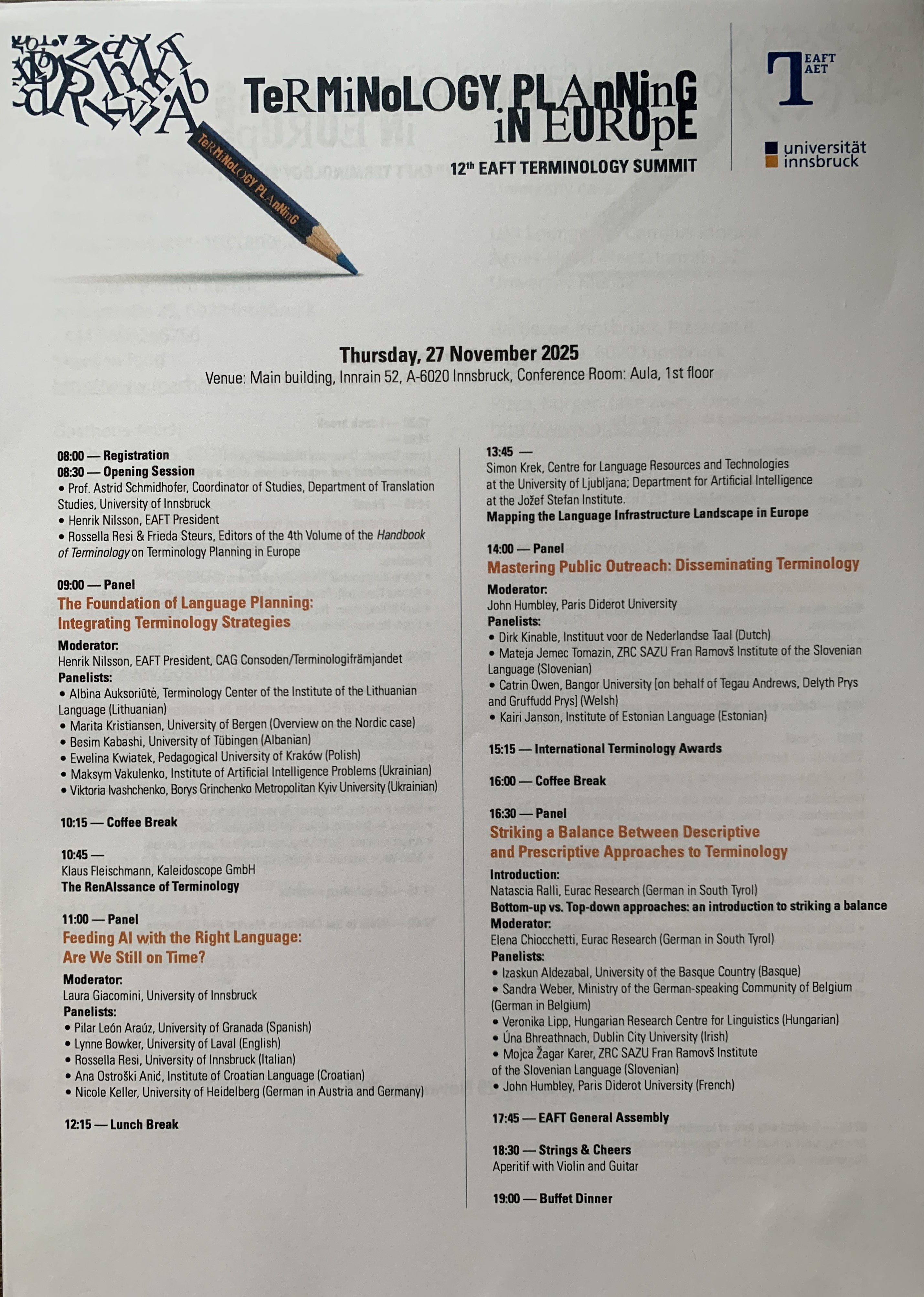 | 12813 | Terminology Planning in Europe | Development of national terminology as a component of state-building: History, present, prospects: The Ukrainian case | Університет Інсбрука |