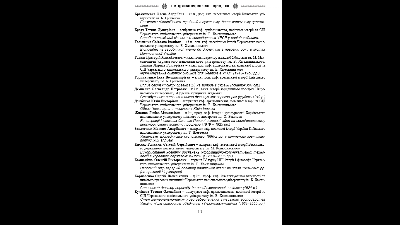 | 155 | Шості Гуржіївські історичні читання | Вплив сектантських організацій на молодь в Україні (початок ХХІ ст.) | м. Черкаси |