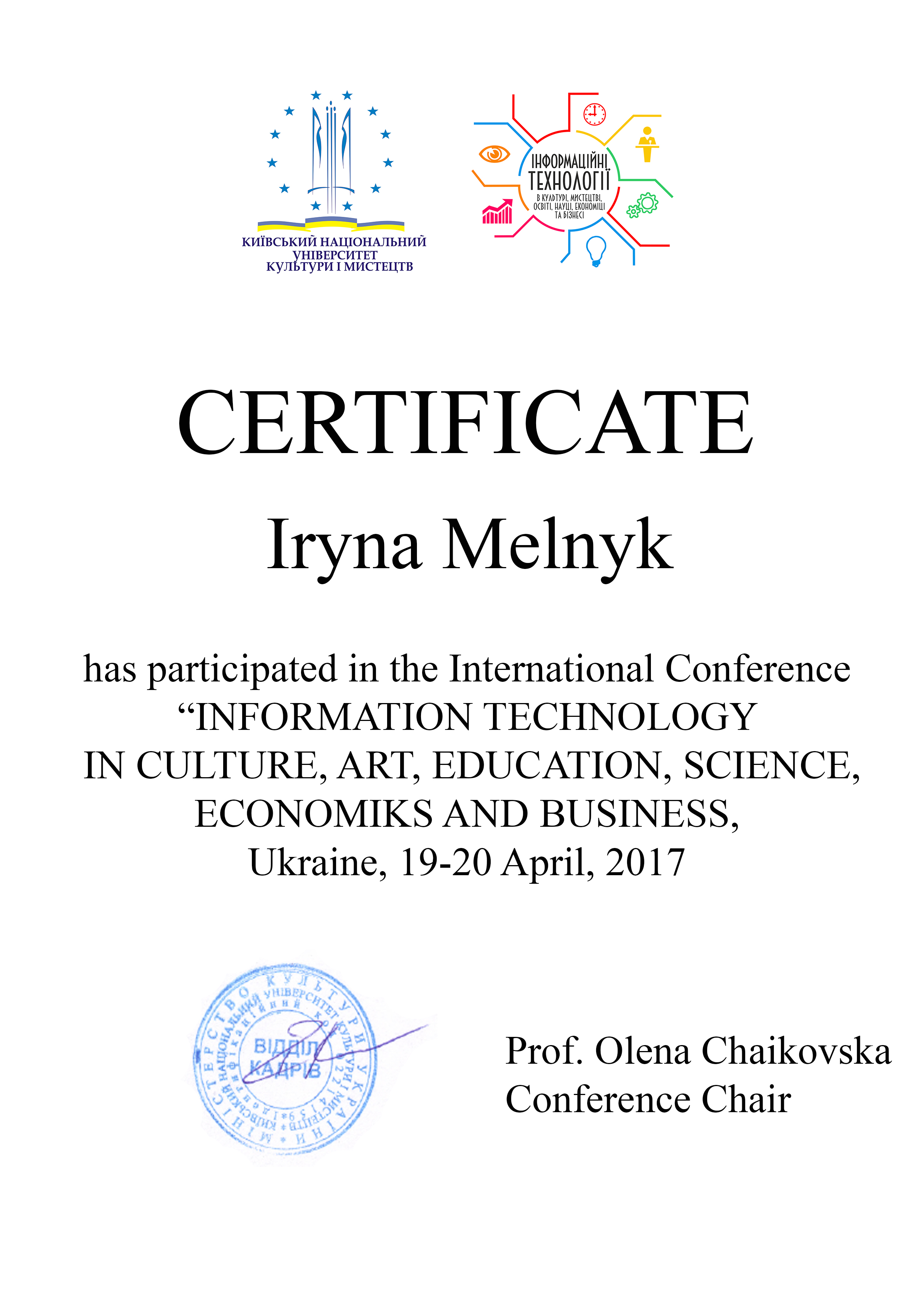 | 3414 | ІКТ | Інший модуль | Сертифікат Мельник .pdf | 25.06.2019 00:00 |