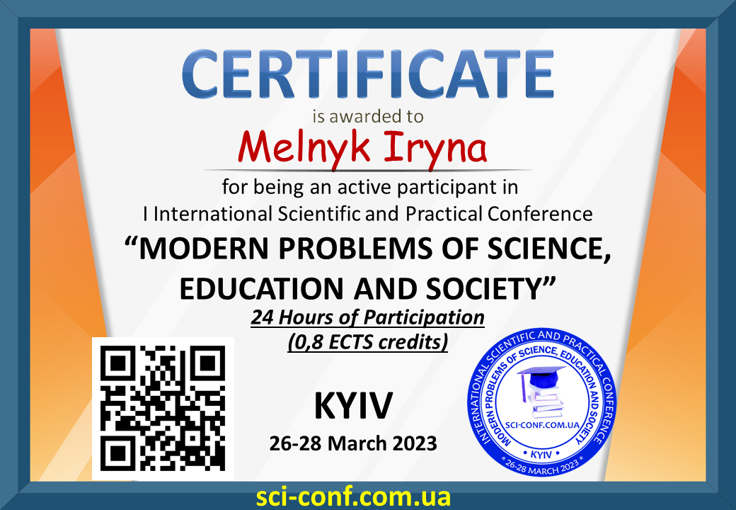 | 9083 | MODERN PROBLEMS OF SCIENCE, EDUCATION AND SOCIETY | СТОРІТЕЛІНГ, ЯК ОДИН З МЕТОДІВ ОРГАНІЗАЦІЇ НАВЧАЛЬНОГО ПРОЦЕСУ | Київ |
