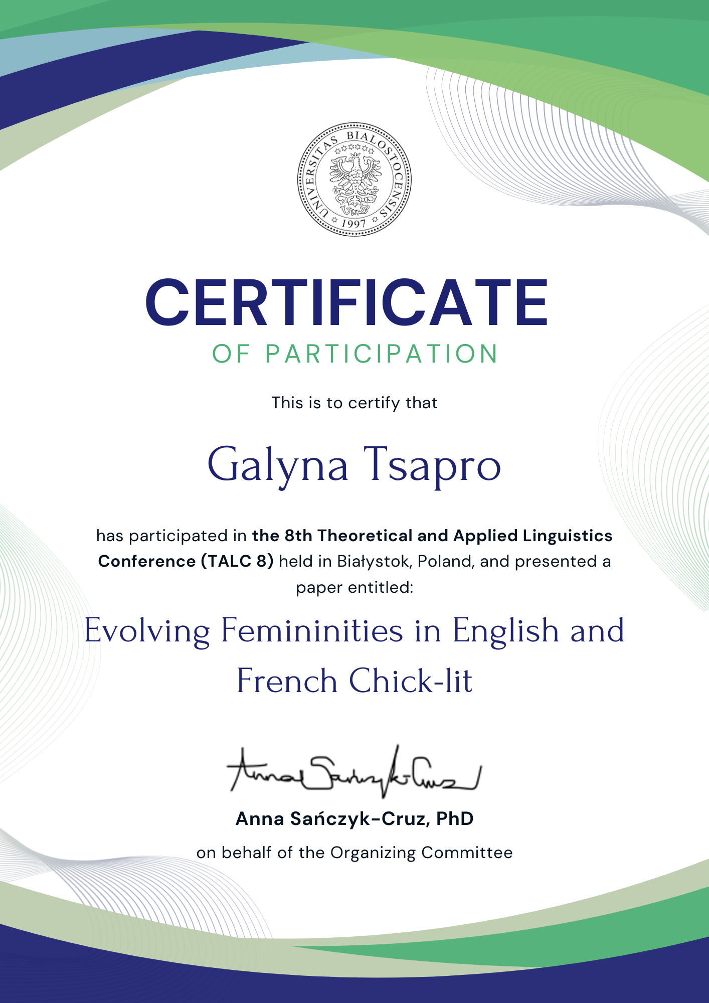 | 13096 | The 8th Theoretical and Applied Linguistics Conference (TALC 8) | Evolving Femininities in English and French Chick-lit | Bialostok, Poland |