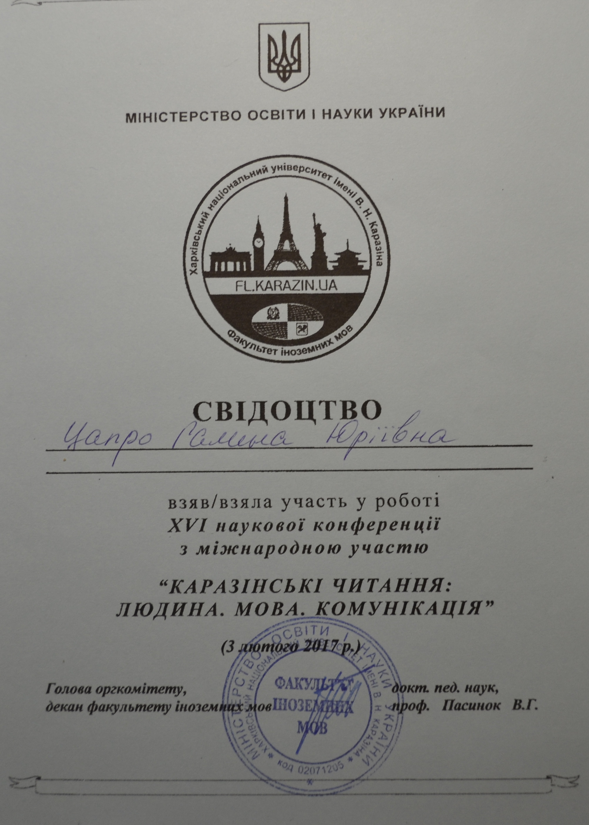 | 2227 | XVI наукова конференція з міжнародною участю "Каразинські читання: Людина. Мова. Комунікація" | Gender Aspect of Provacative Tactics in Interviews | м. Харків |