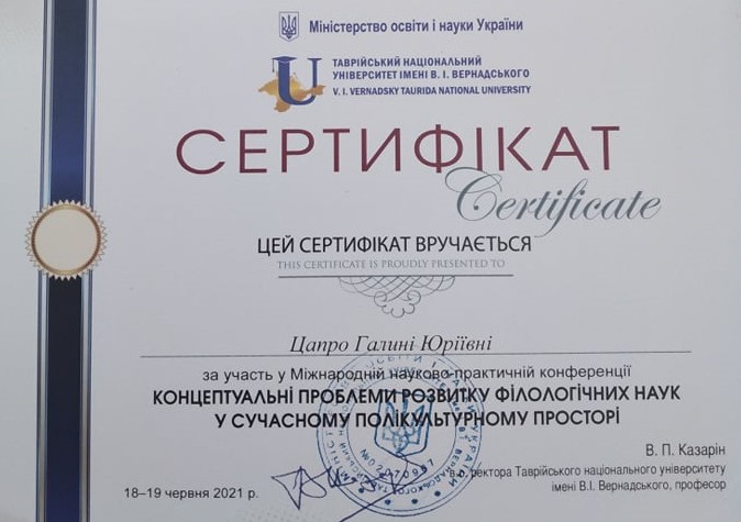 | 2226 | Міжнародна міждисциплінарна науково-практична конференція "Комунікативний дискурс у полікультурному просторі" | I-Representation in Poems by Christina Rossetti: Gender Aspect | м. Миколаїв |