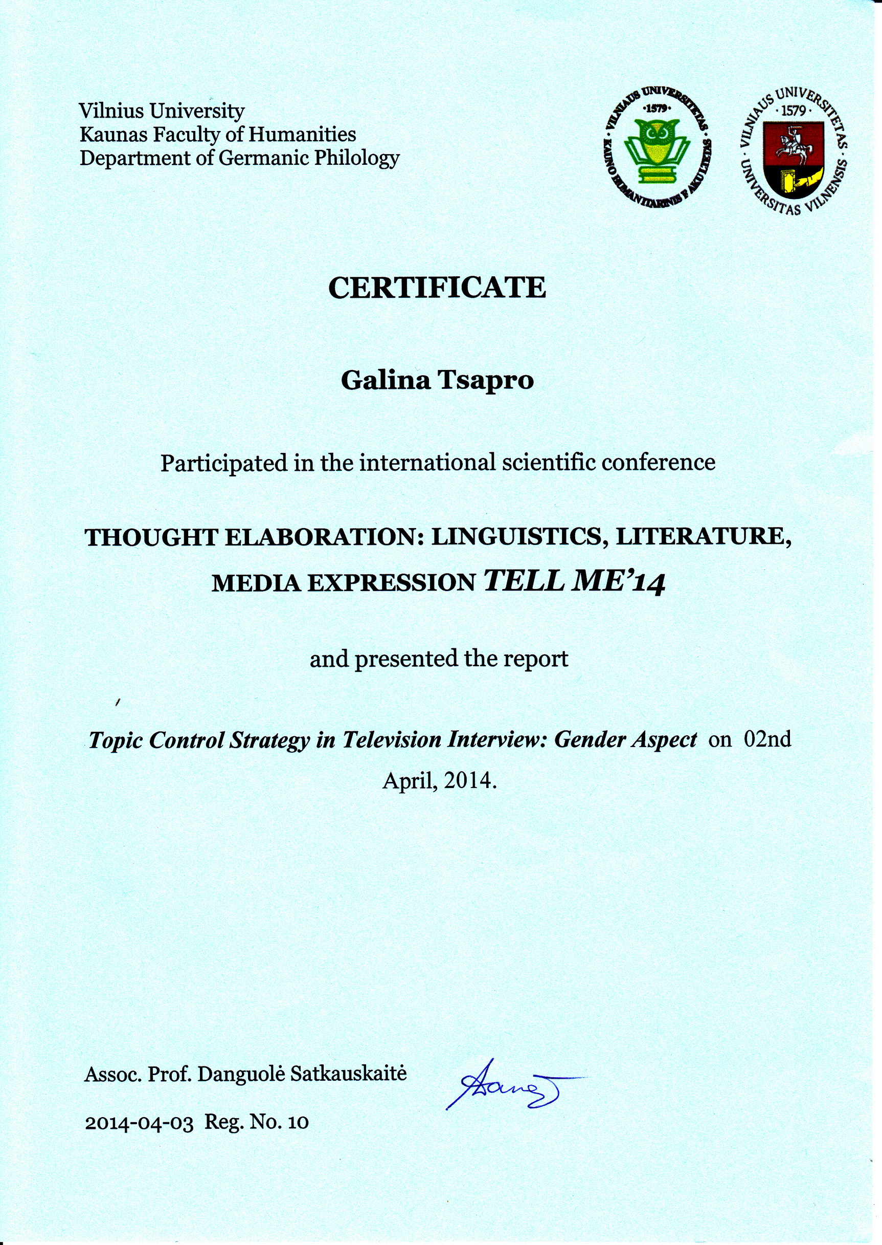 | 841 | Міжнародна наукова конференція 'Thought Elaboration: Linguistics, Literature, Media Expression TELL ME'14' | Topic Control Strategy in Television Interview: Gender Aspect | м. Каунас, Литва |
