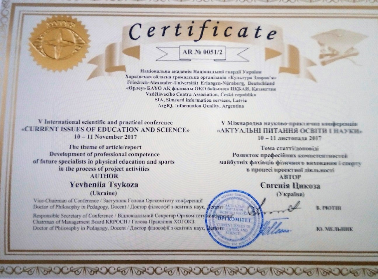 ID Назва Тема доповіді Місце проведення Документ, що засвідчує Дата проведення