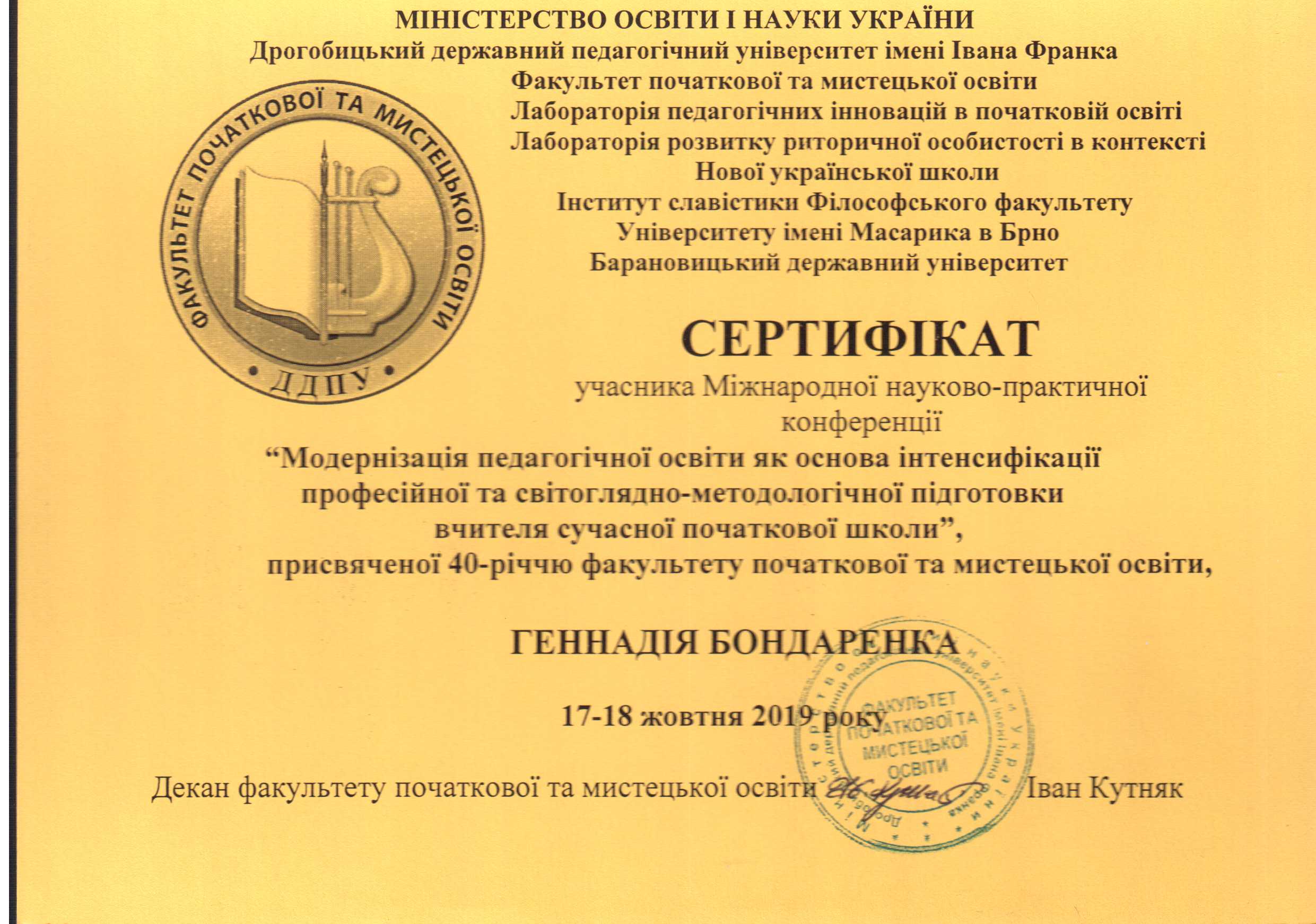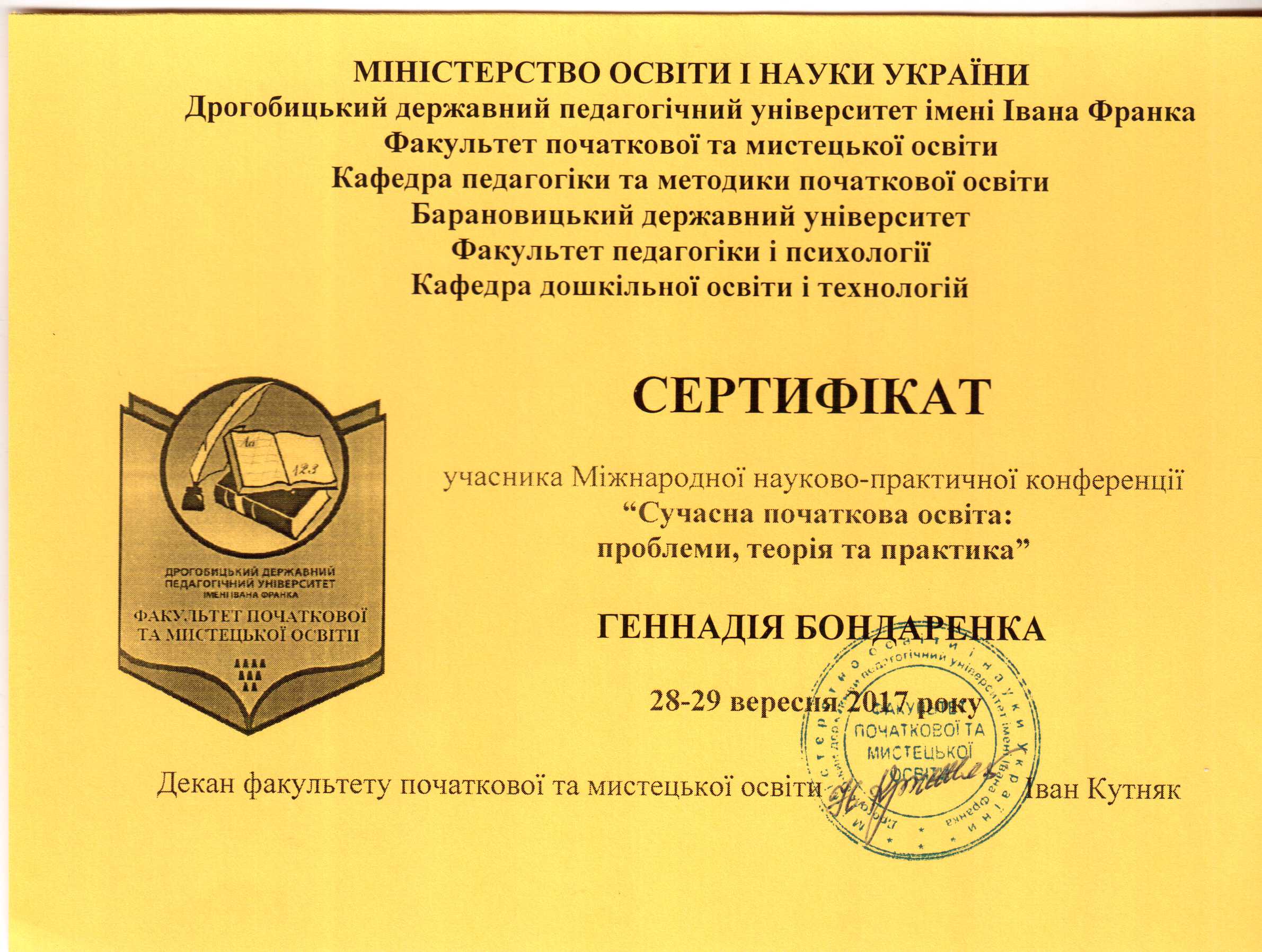 | 7318 | Міжнародна науково-практична конференція "Сучасна початкова освіта в умовах її реформування: проблеми та перспективи" | Інновації в професійній підготовці вчителя початкових класів (досвід кафедри початкової освіти Педагогічного інституту Університету Грінченка) | Дрогобицький державний педагогічний університет імені Івана Франка |