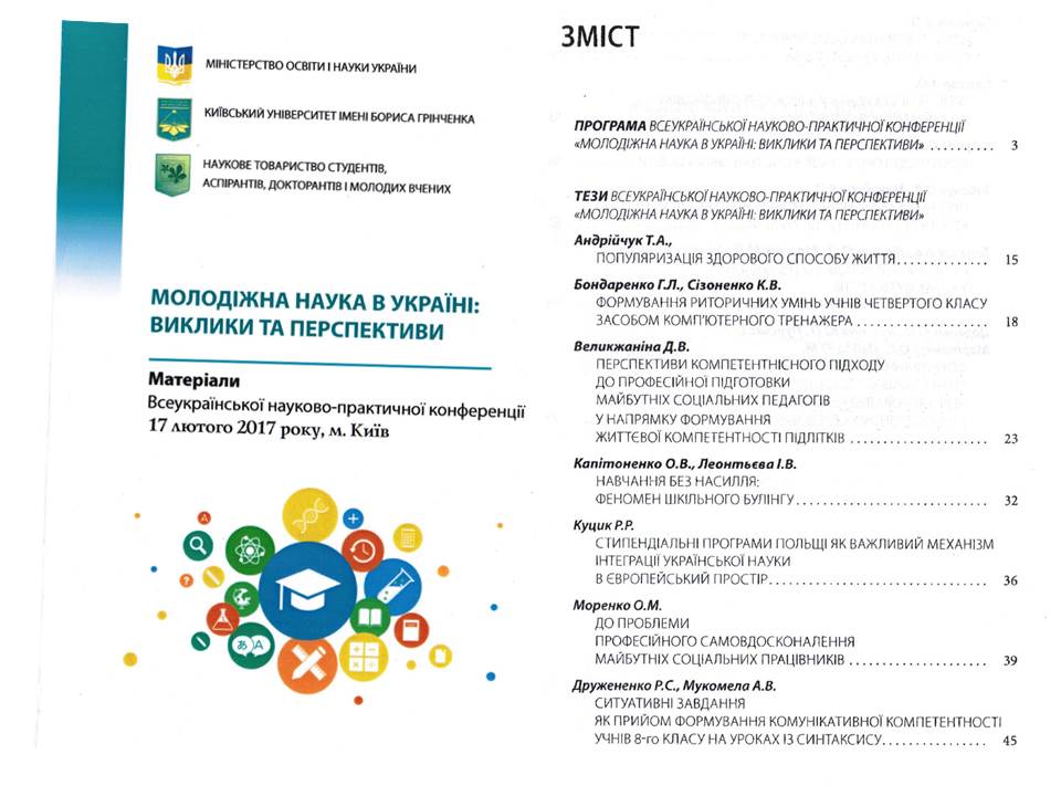 | 2349 | Всеукраїнська науково-практична інтернет-конференції «Дошкільна і початкова освіта: сьогодення і перспективи розвитку» | Учитель початкової школи як суб’єкт мовленнєво-риторичної діяльності | м. Київ, Київський університет імені Бориса Грінченка |