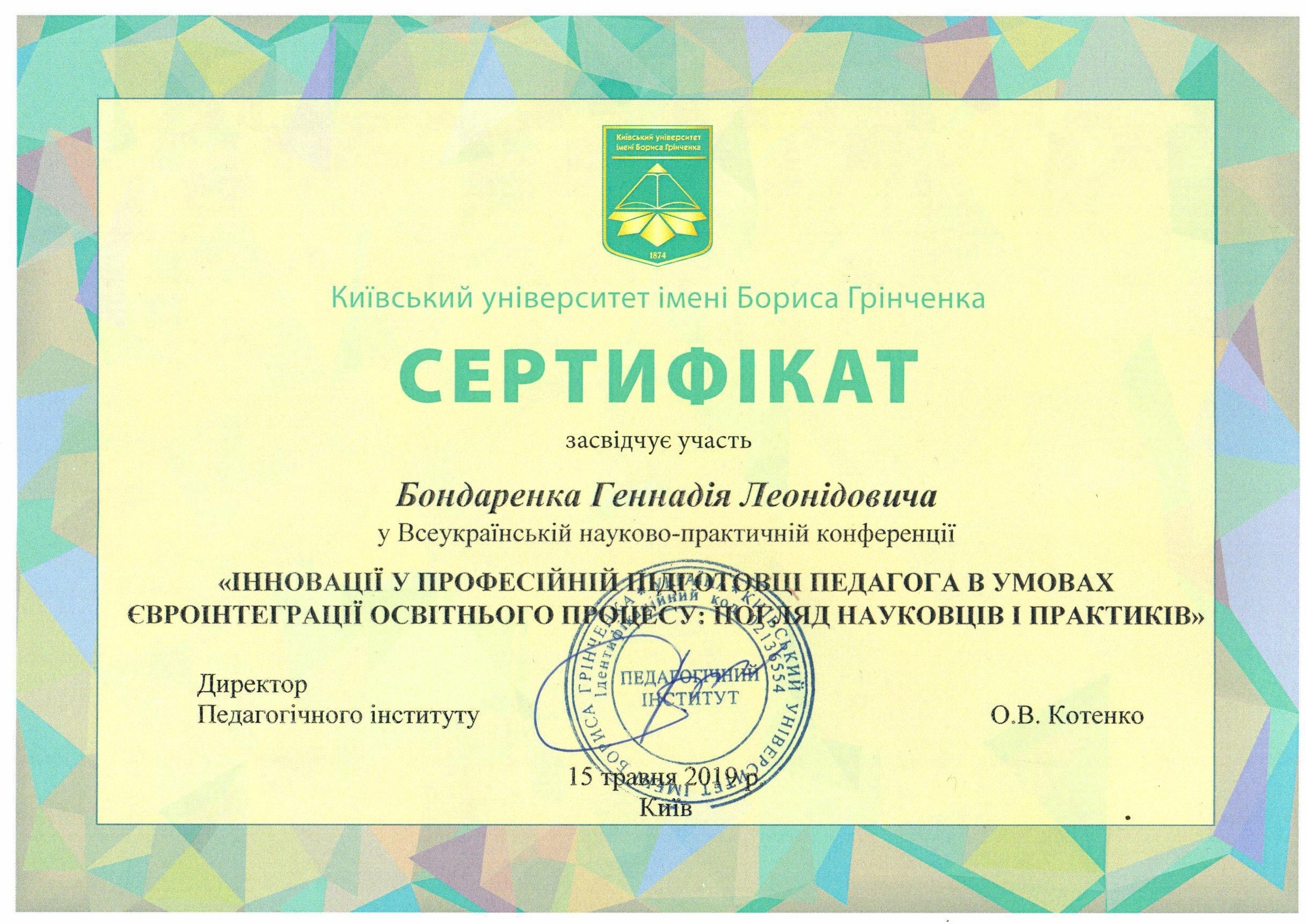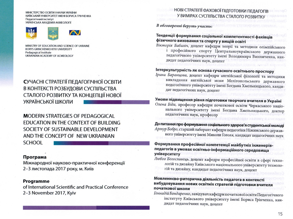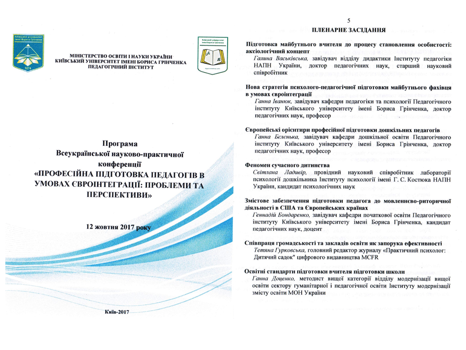 | 1259 | "Професійна підготовка педагогів в умовах євроінтеграції: проблеми та перспективи" | Всеукраїнська науково-практична конференція | Київський університет імені Бориса Грінченка | 12.10.2017 00:00 | 5 |