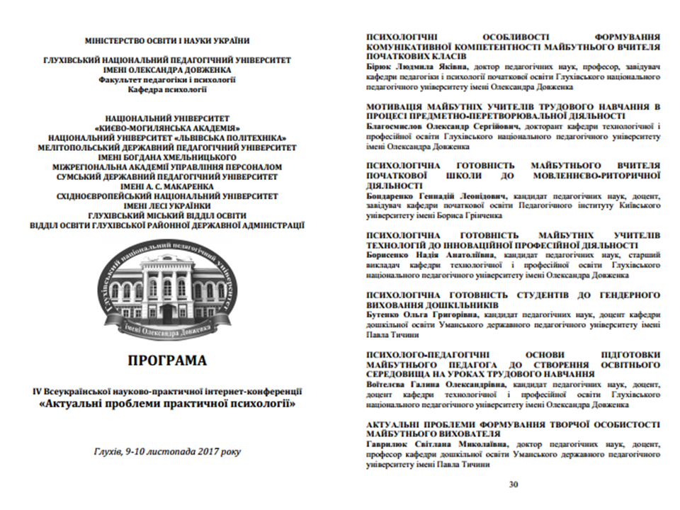 | 2354 | IV Всеукраїнська науково-практична інтернет-конференція "Актуальні проблеми практичної психології" | Психологічна готовність майбутнього вчителя початкової школи до мовленнєво-риторичної діяльності | м. Глухів, Глухівський національний педагогічний університет імені Олександра Довженка |